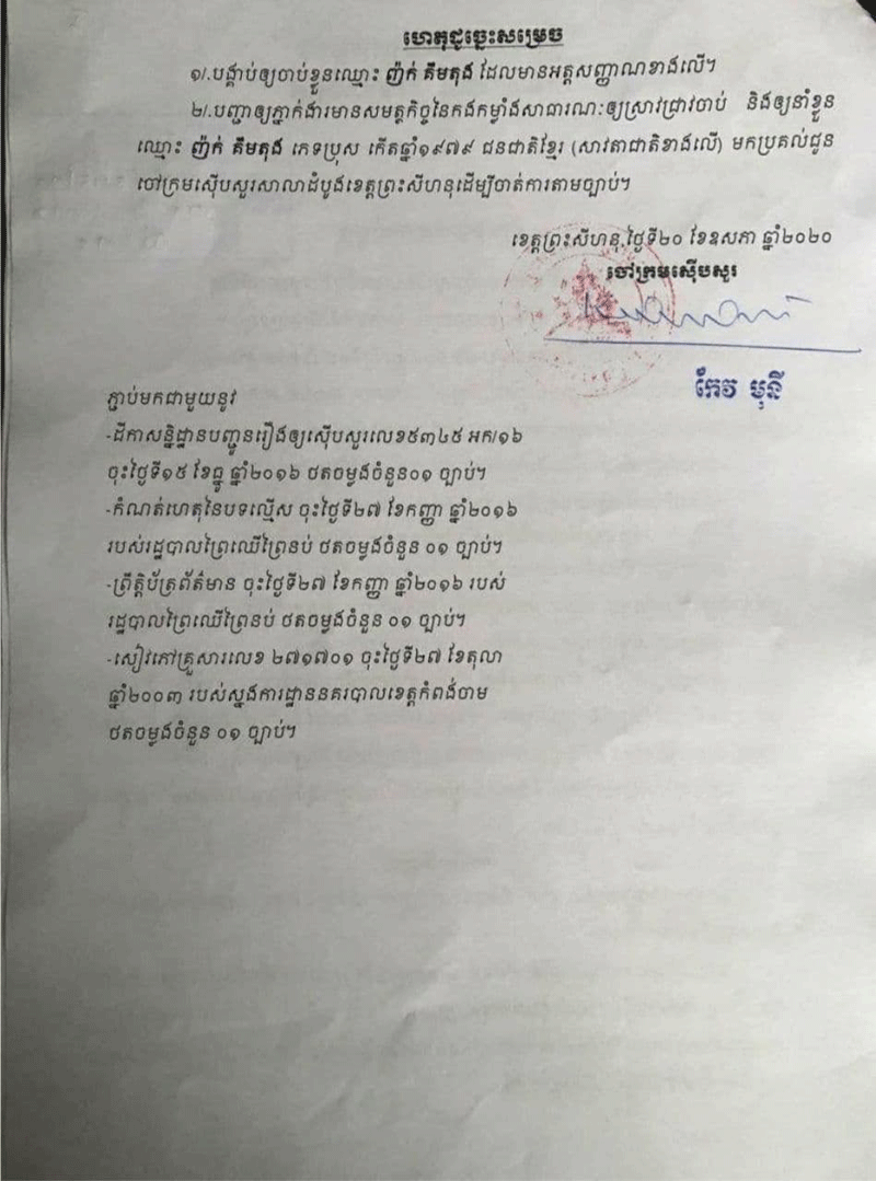 ជនសង្ស័យទាំងនេះត្រូវបានចាប់ខ្លួនជាបន្តបន្ទាប់ក្រោមបទបញ្ជារបស់លោកឧត្តមសេនីយ៍ឯក ឌី វិជ្ជា អគ្គស្នងការរងនគរបាលជាតិ និងជាប្រធានគណៈកម្មការប្រមូលព័ត៌មានស្រាវ ជ្រាវស៊ើបអង្កេតករណីដីធ្លី និងបង្ការទប់ស្កាត់ បង្ក្រាបការទន្ទ្រានកាន់កាប់ដីរបស់រដ្ឋដោយ ខុសច្បាប់ និងឧត្តមសេនីយ៍ឯក យឹម លាង ជាអនុប្រធាន ព្រមទាំងសមាជិកក្រុម ដោយបានសហការជាមួយសមត្ថកិច្ចជំនាញពាក់ព័ន្ធនៅខេត្តព្រះសីហនុ។