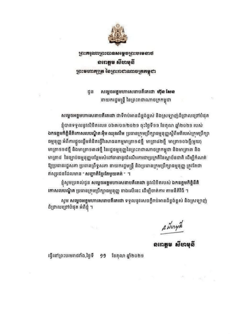 បើតាមព្រះរាជសារ ព្រះមហាក្សត្រ បានសូមប្រគល់ជូនសម្តេចតេជោ នូវលិខិតរបស់ ឯកឧត្តមកិត្តិនីតិ កោសលបណ្ឌិត ប្រធានក្រុមប្រឹក្សាធម្មនុញ្ញ ដើម្បីចាត់ការតាមនីតិវិធី៕