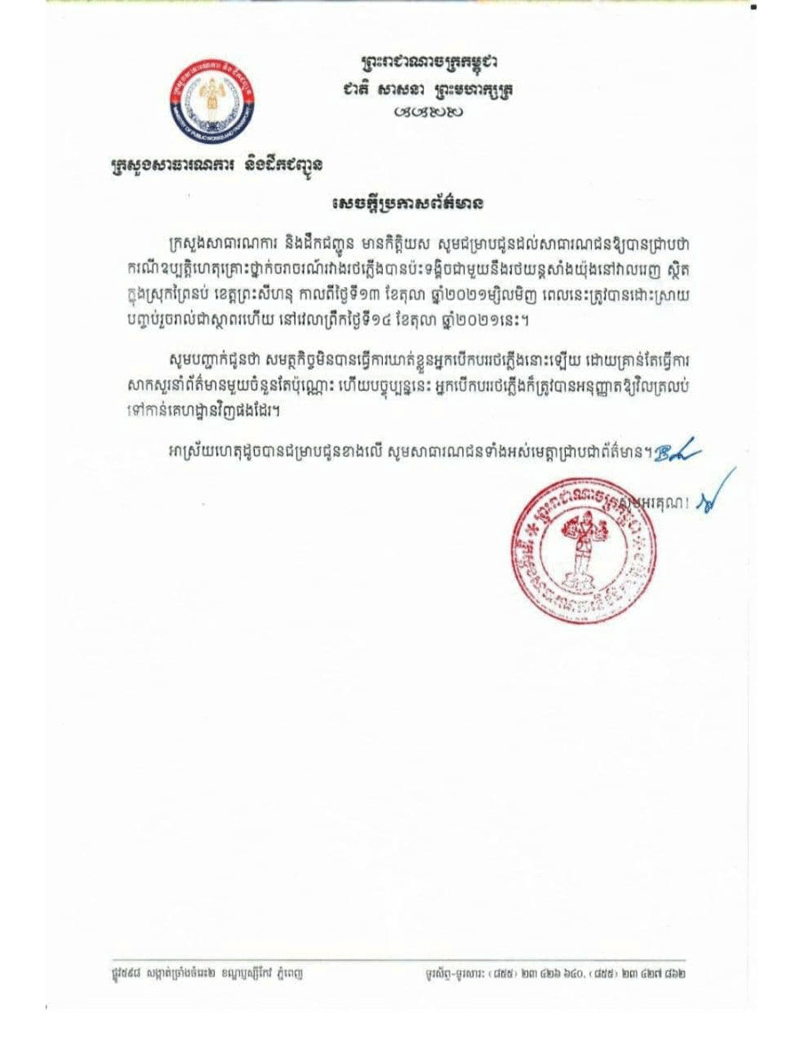 ព្រះសីហនុៈ ករណី ឧប្បត្តិហេតុ គ្រោះថ្នាក់ ចរាចរណ៍ រវាង រថភ្លើង ប៉ះទង្គិច ជាមួយនឹង រថយន្ត សាំង យ៉ុង នៅ វាលរេញ ស្ថិតក្នុង ស្រុក ព្រៃនប់ ខេត្ត ព្រះសីហនុ កាលពី ថ្ងៃទី ១៣ ខែតុលា ឆ្នាំ ២០២១ បាន ត្រូវ ដោះស្រាយ បញ្ចប់ រួចហើយ នៅ ថ្ងៃទី ១៤ ខែតុលា នេះ ។ នេះ បើ យោងតាម សេចក្ដីប្រកាស ព័ត៌មាន របស់ ក្រសួង សាធារណការ និង ដឹកជញ្ជូន ។