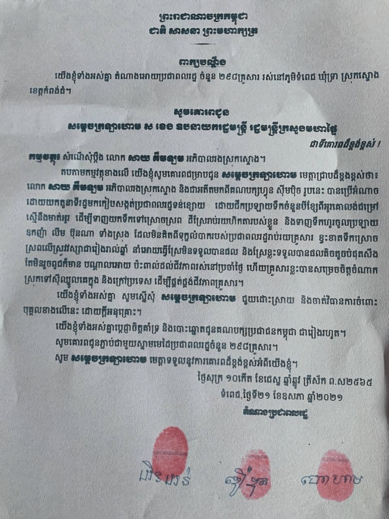 ពួកគាត់បន្ថែមថា ជាការពិត ពួកគាត់មិនចង់ផ្តិតមេដៃគាំទ្រ ទម្លាក់ទេ ព្រោះលោក លឹម ប៊ុនហេង ប្រធានការិយាល័យភូមិបាលស្រុកស្ទោង គឺជាមនុស្សល្អ បានបម្រើប្រជាពលរដ្ឋ គ្រប់ពេលវេលា។ ចំណែកលោកអភិបាលស្រុក ក៏ជាមនុស្ស រាប់អានគ្នាទៅវិញទៅមក។