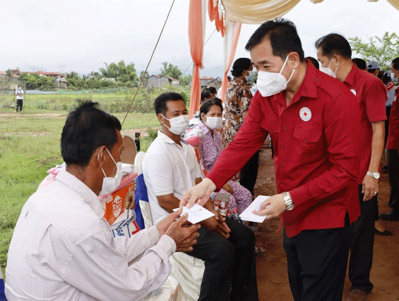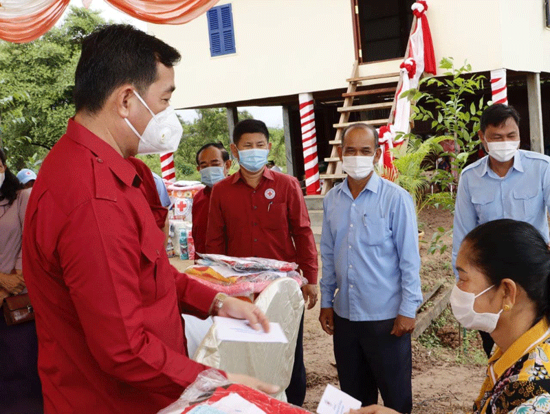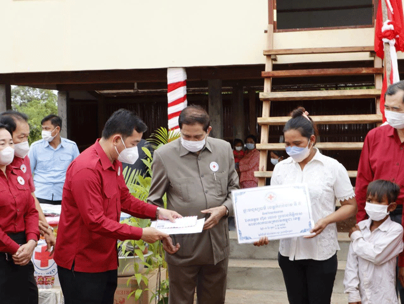 ជាមួយគ្នា នោះ សាខាកាកបាទក្រហមកម្ពុជា បានផ្តល់ជូនអំណោយមនុស្សធម៌ ជាសម្ភារ គ្រឿងឧបភោគបរិភោគ សម្រាប់សង្កត់ផ្ទះ រួមមាន៖ អង្ករ ៥០kg, មី ២កេស, ត្រីខ ២០កំប៉ុង, ទឹកត្រី ១២ដប, ទឹកស៊ីអ៊ីវ ១២ដប, ឃីត (មុង ភួយ សារុង ក្រមា) ២កញ្ចប់, អាវយឺត ១៦, សម្ភារផ្ទះបាយ និងសម្ភារប្រេីប្រាស់ក្នុងផ្ទះ ចំនួន ២៧មុខ ព្រមទាំងថវិកា ២០០.០០០រៀល។ បន្ថែមពីនេះ ឯកឧត្តម ហ៊ុន ណេង ក៏បានឧបត្ថម្ភបន្ថែមចំនួន ២លានរៀល។