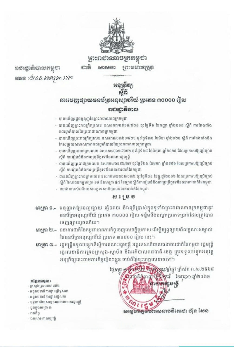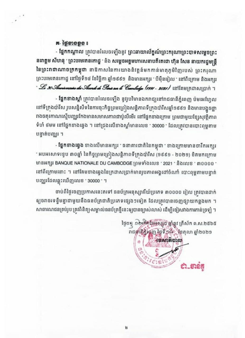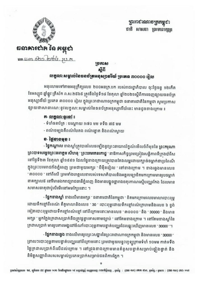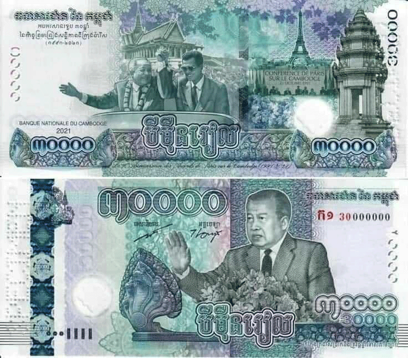 ភ្នំពេញ៖ ដើម្បីអបអរសាទរ ខួប៣០ឆ្នាំនៃកិច្ចព្រមព្រៀងសន្តិភាពទីក្រុងប៉ារីស (២៣ តុលា ១៩៩១- ២៣ តុលា ២០២១) និងខួប៣០ឆ្នាំនៃការយាងនិវត្តន៍របស់ ព្រះករុណាព្រះបាទសម្តេចព្រះនរោត្តម សីហនុ ព្រះបរមរតនកោដ្ឋ មកកាន់មាតុភូមិវិញ (១៤ វិច្ឆិកា ១៩៩១ – ១៤ វិច្ឆិកា ២០២១) រាជរដ្ឋាភិបាលកម្ពុជា បានអនុញ្ញាតឱ្យធនាគារជាតិនៃកម្ពុជា ចេញផ្សាយធនប័ត្រអនុស្សាវរីយ៍ប្រភេទ ៣០០០០ រៀល គំរូថ្មី ដើម្បីដាក់ឱ្យធ្វើចរាចរ និងប្រើប្រាស់ទូទាំងព្រះរាជាណាចក្រកម្ពុជា ទន្ទឹមនឹងបណ្តាប្រភេទក្រដាសប្រាក់ ដែលបានចេញផ្សាយរួចហើយ។
