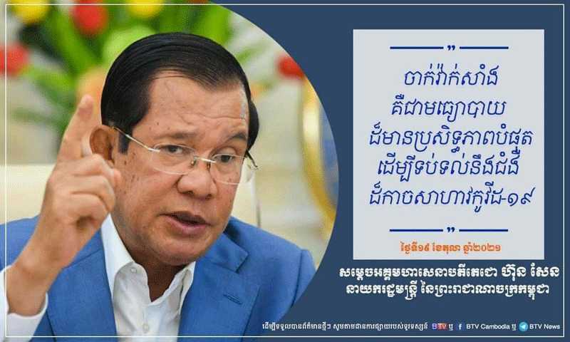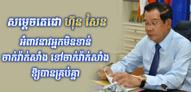 ភ្នំពេញៈ សម្តេចតេជោ ហ៊ុន សែន ប្រមុខរាជរដ្ឋាភិបាលកម្ពុជា បានបន្តអំពាវនាវដោយទទូចទៅកាន់ប្រជាពលរដ្ឋមិនទាន់បានចាក់វ៉ាក់សាំងបង្ការជំងឺកូវីដ១៩ ឱ្យទៅចាក់វ៉ាក់សាំងទាំងអស់គ្នា ដើម្បីបានកងការពារសុខភាពពីការយាយីនៃជំងឺកូវីដ១៩។