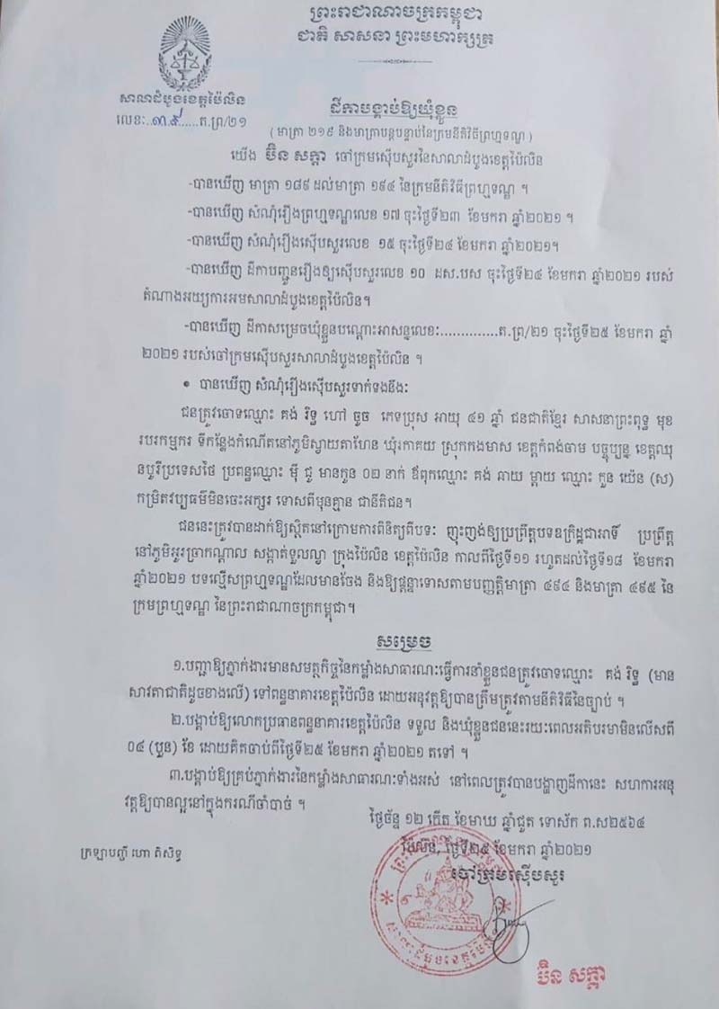 បើតាមប្រភពដីការបស់លោក ប៊ិន សក្តា ចៅក្រមស៊ើបសួរ នៃសាលាដំបូងខេត្តប៉ៃលិន បានឱ្យដឹងថា ៖ តាមដីកាលេខ៣៩ ត.ព្រ/២១ ចុះថ្ងៃទី២៥ ខែមករា ឆ្នាំ២០២១ ខាងលោកបានសម្រេចបញ្ជា ឱ្យភ្នាក់ងារមានសមត្ថកិច្ច នៃកម្លាំងសាធារណ: ធ្វើការនាំខ្លួនជនត្រូវចោទ ឈ្មោះ គង់ រិទ្ធ (មានសាវតាជាតិដូចខាងលើ) ទៅពន្ធនាគារខេត្តប៉ៃលិន ដោយអនុវត្ត ឱ្យបានត្រឹមត្រូវតាមនីតិវិធីនៃច្បាប់ ។ ប្រភពបន្តទៀតថា បង្គាប់ឱ្យលោកប្រធានពន្ធនាគារខេត្តប៉ៃលិន ទទួល និងឃុំខ្លួន ជននេះ រយ:ពេលអតិបរិមា មិនលើសពី៤ខែ ដោយគិតចាប់ពីថ្ងៃទី២៥ ខែមករា ឆ្នាំ២០២១ តទៅ បង្គាប់ឱ្យគ្រប់ភ្នាក់ងារ នៃកម្លាំងសាធារណ:ទាំងអស់ នៅពេលត្រូវបានបង្ហាញដីកានេះ សហការអនុ វត្ត ឱ្យបានល្អនៅក្នុងករណីចាំបាច់ ។ ប្រភពបញ្ជាក់ថា លោកចៅក្រមសាលាដំបូងខេត្តប៉ៃលិន ក៏បានជូនជារបារយការណ៍ ដល់លោកជំទាវ បាន ស្រីមុំ អភិបាល នៃគណ:អភិបាលខេត្តប៉ៃលិនជ្រាបជាដំណឹងផងដែរ ៕ ដោយ ៖ នីយ៉ា