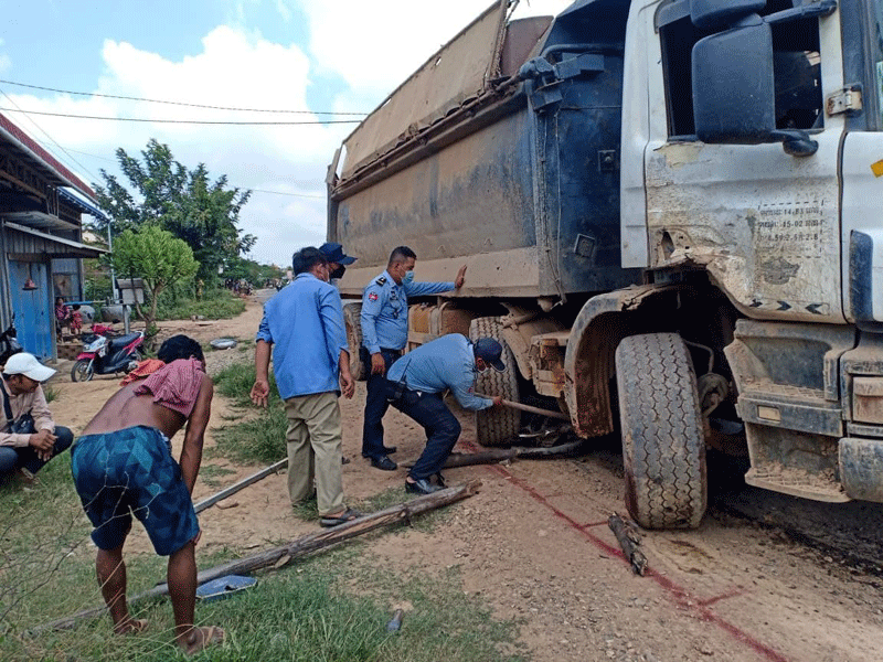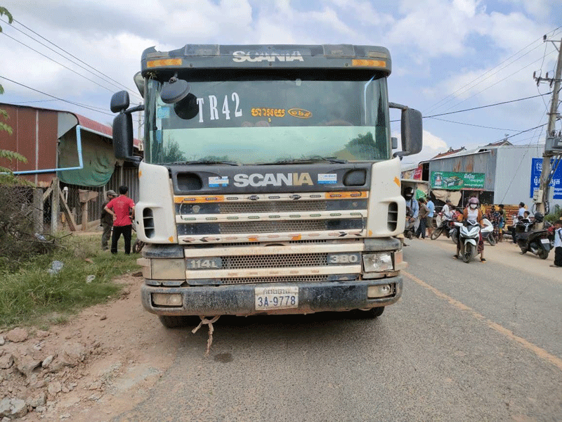 លុះមកដល់ចំណុចខាងលើក៏ត្រូវរថយន្ត១គ្រឿងម៉ាកScania ធុនបែនធំភ្លៅ៤ ពណ៌ស ស្លាកលេខកំពង់ចាម 3A-9778 (ដឹកដី) បើកបរដោយឈ្មោះ កែវ សំណាង ភេទប្រុស អាយុ២៨ឆ្នាំជនជាតិខ្មែរ សញ្ជាតិខ្មែរ នៅភូមិស្ថាពរ ឃុំប៉ាលហា ស្រុកត្បែងមានជ័យ ខេត្តព្រះវិហារ ជាកម្មសិទ្ធរបស់ឈ្មោះ វ៉ា បើកបរក្នុងទិសដៅពី ជើងទៅត្បូង បុកអូសកិន មនុស្សបែកខ្ទេចតែម្តង។