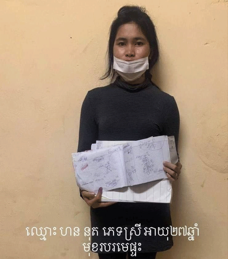 ចំណែកស្រ្តីម្នាក់ ឈ្មោះ សុខ ឌីណា ហៅយាយម៉ៅ អាយុ៥៩ឆ្នាំ បានលើកដៃសំពះស្រែកយំឱ្យដឹងថា ៖ កាលពីមុន គាត់ធ្លាប់កត់កន្ទុយលេខឆ្នោតឱ្យគេមែន ប៉ុន្តែក្រោយពីទទួលបានការណែនាំពីអាជ្ញាធរខេត្ត គាត់ក៏បានឈប់លេងអស់រយ:ពេលជាង១ខែមកហើយ លុះគាត់ជាប់រវល់ចេញទៅផ្សារមួយភ្លែត ស្រាប់តែកូនប្រសារស្រីអត់ដឹង ស្មានតែគាត់នៅលេង ក៏កត់លេខឆ្នោតឱ្យគេ ជាមន្រ្តីនគរបាល ក៏ទទួលរងការចាប់ខ្លួនតែម្តង។