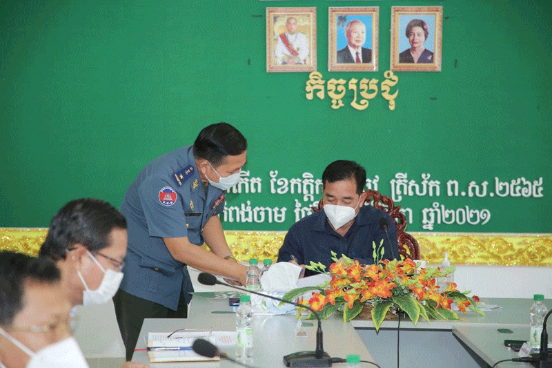 កំពង់ចាម : ឯកឧត្តម អ៊ុន ចាន់ដា អភិបាលនៃគណៈអភិបាលខេត្តកំពង់ចាម នៅ ថ្ងៃទី ១៧ ខែវិច្ឆិកា ឆ្នាំ ២០២១នេះ បាន ដឹកនាំកិច្ចប្រជុំគណៈបញ្ជាការឯកភាពខេត្ត ដើម្បីពិនិត្យការរៀបចំ ផែនការការពារ សន្តិសុខ សណ្តាប់ធ្នាប់ជូនថ្នាក់ដឹកនាំ ក្នុងពិធីសម្ពោធស្ពានមិត្តភាព កម្ពុជា-ចិន ស្ទឹងត្រង់-ក្រូចឆ្មារ និងបើកការដ្ឋានគម្រោងសាងសង់ ផ្លូវជាតិលេខ ៧១C ដែលនឹងប្រារព្ធឡើងនាពេលឆាប់ៗខាងមុខនេះ នៅលើទឹកដីស្រុកស្ទឹងត្រង់ ខេត្តកំពង់ចាម ។