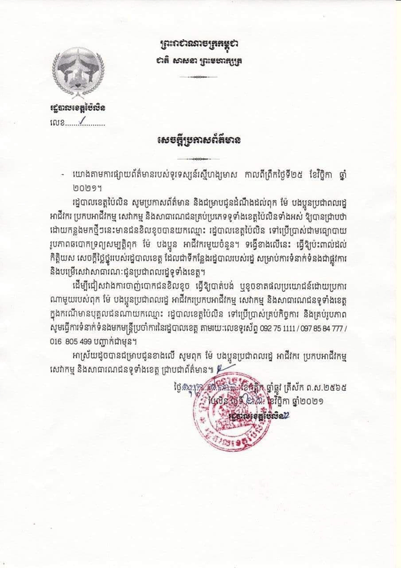 ខេត្តប៉ៃលិន ៖ រហូតដល់ថ្ងៃទី២៦.១១.២០២១នេះ នៅក្នុងសេចក្តីប្រកាសរបស់រដ្ឋបាលខេត្តប៉ៃលិន បានឱ្យដឹងថា យោងតាមការផ្សាយព័ត៌មានរបស់ទូរទស្សន៍រស្មីហង្សមាស កាលពីព្រឹកថ្ងៃទី២៥ ឆ្នាំ២០២១។ រដ្ឋបាលខេត្តប៉ៃលិន សូមប្រកាសព័ត៌មាន និងជម្រាបជូនដំណឹងដល់ពុកម៉ែ បងប្អូនប្រជាពលរដ្ឋអាជីវករ ប្រកបអាជីវកម្មសេវាកម្ម និងសាធារណជនគ្រប់ប្រភេទទូទាំងខេត្តប៉ៃលិនទាំងអស់ ឱ្យបានជ្រាបថា ដោយកន្លងមកថ្មីៗនេះ មានជនខិលខូចបានយកឈ្មោះ រដ្ឋបាលខេត្តប៉ៃលិន ទៅប្រើប្រាស់ជាមធ្យោបាយ រូបភាព ឆបោកទ្រព្យសម្បតិ្ត ពុក ម៉ែ បងប្អូន អាជីវករមួយចំនួន។ ទង្វើខាងលើនេះ ធ្វើឱ្យប៉ះពាល់ដល់កិត្តិយស សេចក្តីថ្លៃថ្នូររបស់រដ្ឋបាលខេត្ត ដែលជាទីកន្លែងរដ្ឋបាលរបស់រដ្ឋ សម្រាប់ការទំនាក់ទំនងជាផ្លូវការ និងបម្រើសេវាសាធារណ:ជូនប្រជាពលរដ្ឋទូទាំងខេត្ត។
