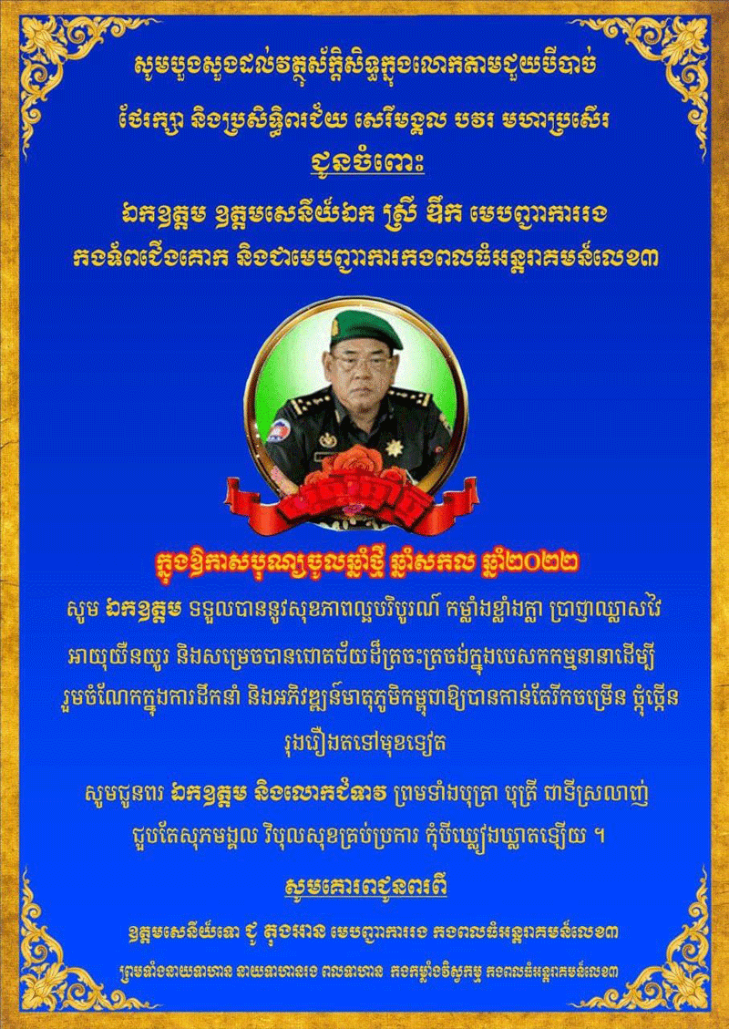 ក្នុងឱកាសដ៏មហោឡារិកនេះ សូមបួងសួងដល់គុណបុណ្យ ព្រះរតនត្រ័យ កែវទាំងបី វត្ថុស័ក្ដិសិទ្ធិក្នុងលោក និងទេវតាឆ្នាំថ្មី សូមប្រោះព្រំសព្ទសាធុការពរ សិរីសួស្ដី ជ័យមង្គលវិបុលសុខ បវរមហាប្រសើរថ្លៃថ្លាជូនចំពោះ ឯកឧត្ត ឧត្តមសេនីយ៍ឯក ស្រី ឌឹក មេបញ្ជាការរងកងទ័ពជើងគោគ និងជាមេបញ្ជាការកងពលធំអន្តរាគមន៍លេខ៣ សូមមានសុខភាពល្អបរិបូរណ៍ កម្លាំងពលំមាំមួន ប្រាជ្ញាភ្លឺថ្លា ជន្មាយុយឺនយូរ និងសម្តេចបានជោគជ័យដ៏ត្រចះត្រចង់ ក្នុងបេសកកម្មនានា ដើម្បីរួមចំណែកក្នុងការដឹកនាំនិងអភិវឌ្ឍន៍មាតុភូមិកម្ពុជា អោយបានកាន់តែរីកចម្រើនរុងរឿងតទៅមុខទៀត។