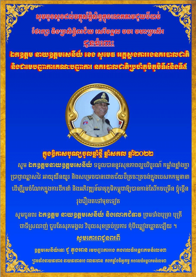 ក្នុងឱកាសដ៏មហោឡារិកនេះ សូមបួងសួងដល់គុណបុណ្យ ព្រះរតនត្រ័យ កែវទាំងបី វត្ថុស័ក្ដិសិទ្ធិក្នុងលោក និងទេវតាឆ្នាំថ្មី សូមប្រោះព្រំសព្ទសាធុការពរ សិរីសួស្ដី ជ័យមង្គលវិបុលសុខ បវរមហាប្រសើរថ្លៃថ្លាជូនចំពោះ ឯកឧត្ត នាយឧត្តមសេនីយ៍ ខេង សាមេធ អគ្គស្នងការរងនគរបាលជាតិនិងជាមេបញ្ជាការគណៈ បញ្ជាការនគរបាលជាតិប្រចាំភូមិភាគទី៤និងទី៥ សូមមានសុខភាពល្អបរិបូរណ៍ កម្លាំងពលំមាំមួន ប្រាជ្ញាភ្លឺថ្លា ជន្មាយុយឺនយូរ និងសម្តេចបានជោគជ័យដ៏ត្រចះត្រចង់ ក្នុងបេសកកម្មនានា ដើម្បីរួមចំណែកក្នុងការដឹកនាំនិងអភិវឌ្ឍន៍មាតុភូមិកម្ពុជា អោយបានកាន់តែរីកចម្រើនរុងរឿងតទៅមុខទៀត។