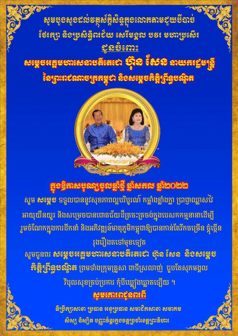 ក្នុងឱកាសដ៏មហោឡារិកនេះ យើងខ្ញុំទាំងអស់គ្នាសូមបួងសួងដល់គុណបុណ្យ ព្រះរតនត្រ័យ កែវទាំងបី វត្ថុស័ក្ដិសិទ្ធិក្នុងលោក និងទេវតាឆ្នាំថ្មី សូមប្រោះព្រំសព្ទសាធុការពរ សិរីសួស្ដី ជ័យមង្គលវិបុលសុខ បវរមហាប្រសើរថ្លៃថ្លាជូនចំពោះ សម្ដេចតេជោ នាយករដ្ឋមន្ត្រី និង សម្ដេចកិត្តិព្រឹទ្ធបណ្ឌិត សូមមានសុខភាពល្អបរិបូរណ៍ កម្លាំងពលំមាំមួន ប្រាជ្ញាភ្លឺថ្លា ជន្មាយុយឺនយូរ ឈ្នះអស់មារស ត្រូវ គ្រប់ទិសទី និងទទួលបាន ជោគជ័យថ្មីប ន្ថែម ទៀត ក្នុងបុព្វ ហេតុជាតិ មាតុភូមិ ប្រជាជន ប្រកប ដោយការអភិវឌ្ឍ និងរីកច ម្រើនត រៀង ទៅ។