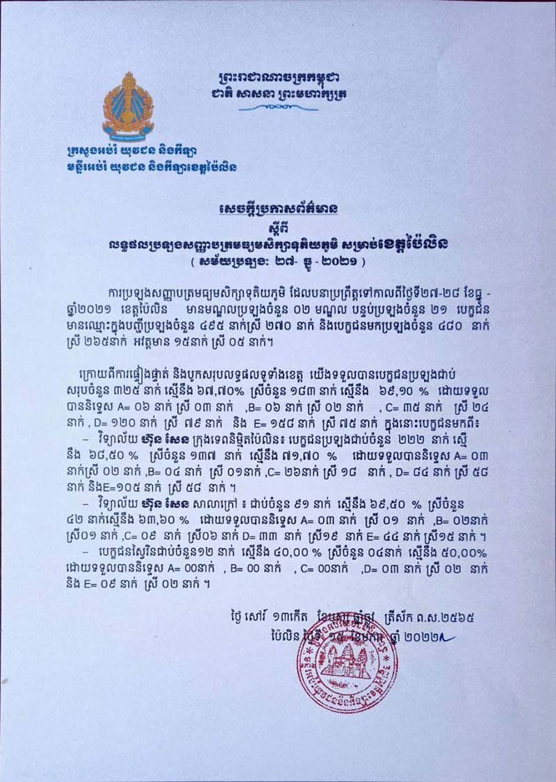 បើយោងតាមស្ថិតិលោក តង់ ធារ៉ា ប្រធានមន្ទីរអប់រំ យុវជន និងកីឡាខេត្តប៉ៃលិន បានឲ្យដឹងថា ៖ សម្រាប់ការប្រឡងសញ្ញាបត្រទុតិយភូមិនៅក្នុងឆ្នាំ២០២១នេះ គឺមានបេក្ខជនប្រឡងទូទាំងខេត្តប៉ៃលិន សរុបចំនួន៤៩៥នាក់ស្រី២៧០នាក់ មណ្ឌលប្រឡងមានចំនួន០២មណ្ឌល និងមាន២១បន្ទប់ ។ជាលទ្ធផលបេក្ខជនប្រឡងជាប់មានចំនួន ៣២៥នាក់ ស្មើនឹង៦៧,៧០% ក្នុងនោះមាននិទ្ទេសA ៦នាក់, និទ្ទេសB ៦នាក់, និទ្ទេសC ៣៥នាក់, និទ្ទេសD ១២០នាក់ និងនិទ្ទេស E ១០៥នាក់៕ ដោយ ៖ នីយ៉ា