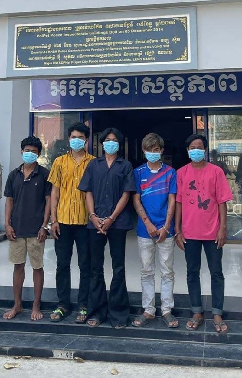 បន្ទាយមានជ័យ៖ កម្លាំងនគរបាលនៃអធិការដ្ឋាននគរបាលក្រុងប៉ោយប៉ែត ចុះឃាត់ខ្លួនជនសង្ស័យមួយក្រុម៥នាក់ ជាបន្តបន្ទាប់ ក្រោយពីធ្វើសកម្មគប់កំបិត ដាវ និងដុំថ្មទៅលើជនរងគ្រោះបណ្តាលធ្លាយពោះស្លាប់ម្នាក់ និងរបួសម្នាក់ ត្រូវបានបញ្ជូនទៅកាន់កម្លាំងនគរបាលជំនាញនៃស្នងការដ្ឋាននគរបាលខេត្តបន្ទាយមានជ័យចាត់ការបន្តនៅរសៀលថ្ងៃទី១៨ ខែមករា ឆ្នាំ២០២២។