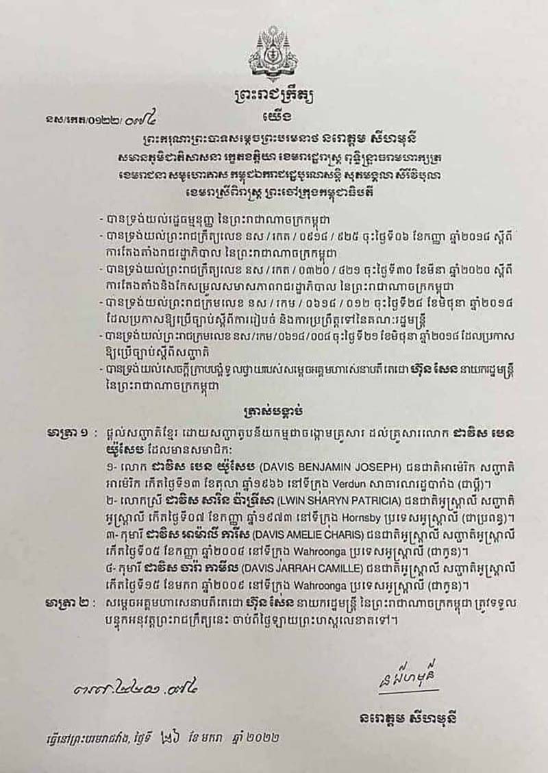 ព្រះវិហារៈ លោក ដាវិស បេន យ៉ូសសែប ជាជនជាតិអាមេរិកាំង និងក្រុមគ្រួសារ សរុបចំនួន៤នាក់ ដែលបានលះបង់កម្លាំងកាយកម្លាំងចិត្ត ដើម្បីបុព្វហេតុការពារ និងអភិរក្សធនធានព្រៃឈើ និងសត្វព្រៃ នៅក្នុងដែនជម្រកសត្វព្រៃភ្នំត្នោត-ភ្នំពក នៅក្នុងខេត្តព្រះវិហារ ត្រូវបានព្រះមហាក្សត្រ នៃព្រះរាជាណាចក្រកម្ពុជា ផ្តល់សញ្ជាតិខ្មែរ ដោយសញ្ជាតូបនីកម្មជាចង្កោមគ្រួសារ។ ព្រះករុណាព្រះបាទសម្តេចព្រះបរមនាថ នរោត្តម សីហមុនី ព្រះមហាក្សត្រ នៃព្រះរាជាណាចក្រកម្ពុជា បានចេញព្រះរាជក្រឹត្យត្រាស់បង្គាប់ផ្តល់សញ្ជាតិខ្មែរ ដោយសញ្ជាតូបនីកម្មជាចង្កោមគ្រួសារ ដល់គ្រួសារលោក ដាវិស បេន យ៉ូសសែប ដែលមានសាមជិក៖ ១.លោកដាវិស បេន យ៉ូសសែប ២.លោកកស្រី ដាវិស សារិន ប៉ាទ្រីសា ៣.កុមារី ដាវិស អាម៉ាលី ការីស ៤.កុមារី ដាវិស ចារ៉ាកាមីល។ នេះ បើយោងតាមព្រះរាជក្រឹត្យចុះថ្ងៃទី២៦ ខែ មករា ឆ្នាំ២០២២ ដែល AMS ទើបតែទទួលបាននៅព្រឹកថ្ងៃទី៣១ ខែមករាឆ្នាំ២០២២នេះ។ លោក ដាវិស បេន យ៉ូសសែប រួមទាំងភរិយា ដែលជាជនជាតិអូស្ត្រាលី បានចូលរួមការពារ និងអភិរក្សព្រៃឈើ សត្វព្រៃ ជាមួយរាជរដ្ឋាភិបាលកម្ពុជា អស់រយៈពេលជាង២០ឆ្នាំហើយ រហូតបានបង្កើតជាតំបន់អភិរក្សសត្វ និងព្រៃឈើនៅភ្នំត្នោត-ភ្នំពក នៅខេត្តព្រះវិហារ។សូមជម្រាបថា លោក ដាវិស បេន យ៉ូសសែប និងក្រុមគ្រួសាររបស់គាត់ និងបានលះបង់កម្លាំងកាយ កម្លាំងចិត្ត ដើម្បីបុព្វហេតុការពារ និងអភិរក្សធនធានព្រៃឈើ និងសត្វព្រៃ នៅក្នុងដែនជម្រកសត្វព្រៃភ្នំត្នោត-ភ្នំពក នៅក្នុងខេត្តព្រះវិហារ ដែលសកម្មភាពនេះ ទទួលបានការគាំទ្រពីក្រសួងបរិស្ថា ក្នុងការងារថែរក្សា និងការពារសម្បត្តិធម្មជាតិ នៅដែនជម្រកសត្វព្រៃភ្នំត្នោត ភ្នំពក ក្នុងខេត្តព្រះវិហារ។ ក្រសួងបរិស្ថាន ពិសេសតាមរយៈឯកឧត្តម សាយ សំអាល់ រដ្ឋមន្រ្តីក្រសួងបរិស្ថាន បានទទួលស្គាល់នូវកិច្ចខិតខំប្រឹងប្រែង និងលើកទឹកចិត្តដល់លោក បេន ដាវិស និងក្រុមគ្រួសារ ដែលបានចូលរួមជាមួយរាជរដ្ឋាភិបាលកម្ពុជា ក្នុងការអភិរក្សធនធានធម្មជាតិ ក្នុងដែនជម្រកសត្វព្រៃភ្នំត្នោត-ភ្នំពក។គួររម្លឹកថា កាលពីខែមករា ឆ្នាំ២០១៩ កន្លងមកនេះ សម្តេចកិត្តិព្រឹទ្ធបណ្ឌិត ប៊ុន រ៉ានី ហ៊ុនសែន ប្រធានកាកបាទក្រហមកម្ពុជា បានប្រគល់ជូនលោក បេន ដេវីស នូវរថយន្ត១គ្រឿង និងម៉ូតូ២គ្រឿង សម្រាប់ដើរល្បាតនៅដែនជម្រកសត្វព្រៃភ្នំត្នោត ភ្នំពក ក្នុងខេត្តព្រះវិហារ។គួរបញ្ជាក់ថា តំបន់ដែនជម្រកសត្វព្រៃភ្នំត្នោត ភ្នំពក ស្ថិតនៅខេត្តព្រះវិហារ និងខេត្តសៀមរាប មានទំហំផ្ទៃដីសរុប ៤២,០៩៧ហិកតា។ក្នុងនោះ លោក បេន បានទទួលការអនុញ្ញាតពីក្រសួងបរិស្ថាន គ្រប់គ្រង និងអភិរក្សលើផ្ទៃដីជាង ៧ពាន់ហិកតា ដែលមានសក្តានុពលធនធា