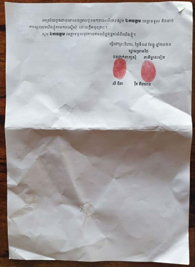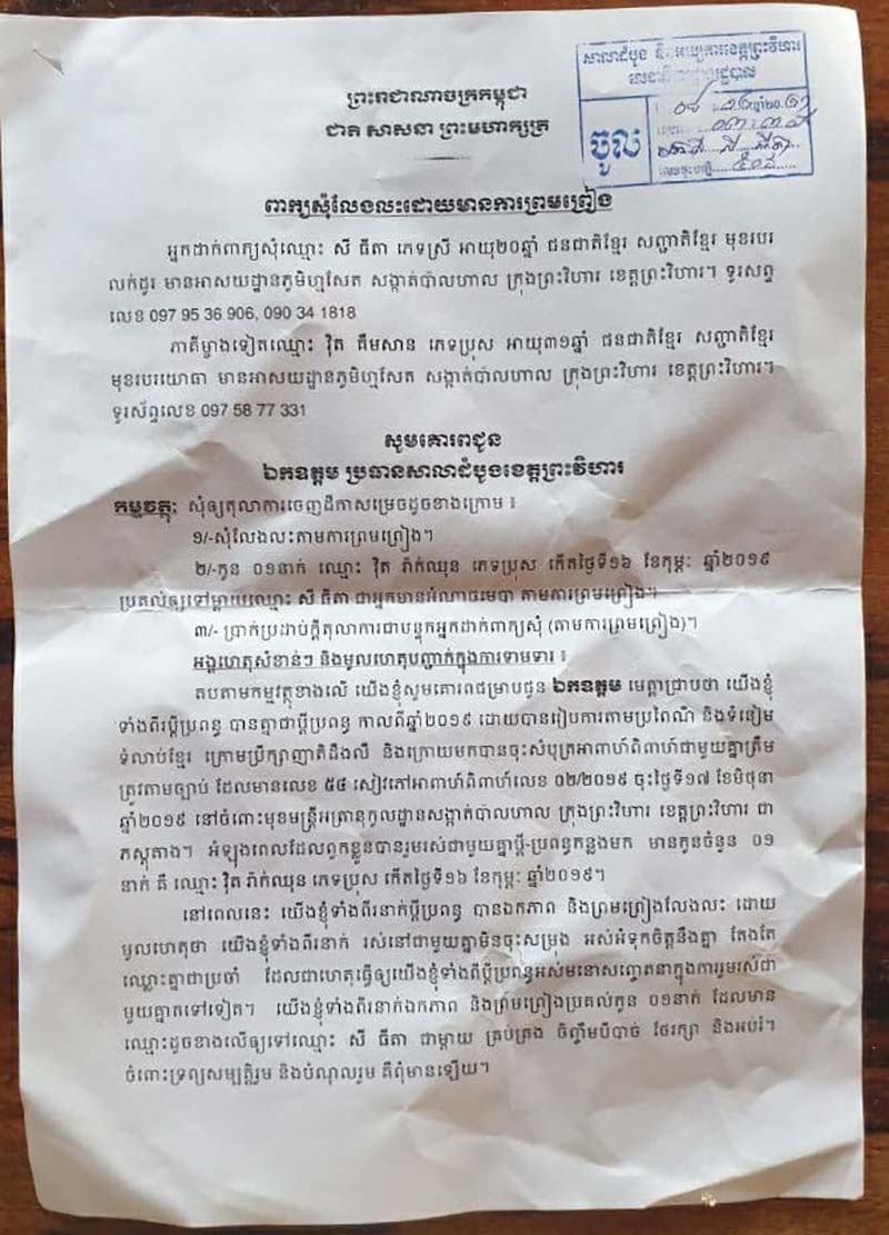 យោងតាមពាក្យសុំលែងលះដោយមានការព្រមព្រៀង ដែលប្តីឈ្មោះវិត គឹមសាន្ត អាយុ៣១ឆ្នាំនិងប្រពន្ធឈ្មោះសី ធីតា អាយុ២០ឆ្នាំ រស់នៅភូមិថ្មសែត សង្កាត់ប៉ាលហាល ក្រុងព្រះវិហារ ខេត្តព្រះវិហារ បានដាក់ពាក្យចូលទៅតុលាការខេត្តព្រះវិហារ កាលពីថ្ងៃទី៨ខែធ្នូឆ្នាំ២០២១ គឺសុំឲ្យតុលាការចេញដីកាសម្រេច សុំលែងលះគ្នាតាមការព្រមព្រៀង ចំណែកកូនប្រុសតូចមួយប្រគល់ទៅឲ្យម្តាយជាអ្នកមានអំណាចមេបាតាមការព្រមព្រៀង។ក្នុងពាក្យស្នើរសុំលែងលះដោយព្រមព្រៀងបានរៀបរាប់ថា៖ពួកគេបានរៀបការពេញច្បាប់ជាមួយគ្នាតាំងពីឆ្នាំ២០១៩មកម្លះ និងបានចុះសំបុត្រអាពាហ៍ពិពាហ៍ត្រឹមត្រូវដល់អាជ្ញាធរដឹងលឺ។ពេលនេះបានឯកភាពនិងព្រមព្រៀងលែងលះ ដោយហេតុផលរស់នៅមិនចុះសម្រុងគ្នា អស់ទំនុកចិត្តគ្នានិងតែងឈ្លោះគ្នាជាប្រចាំឲ្យតែបុរសជាប្ដីចូលផ្ទះពេលណាដេញប្រពន្ធទៅដាក់ពាក្យសុំលេងលះដោយបង្ខំផ្ដិតមេដៃនៅតុលាការផងដែរ។