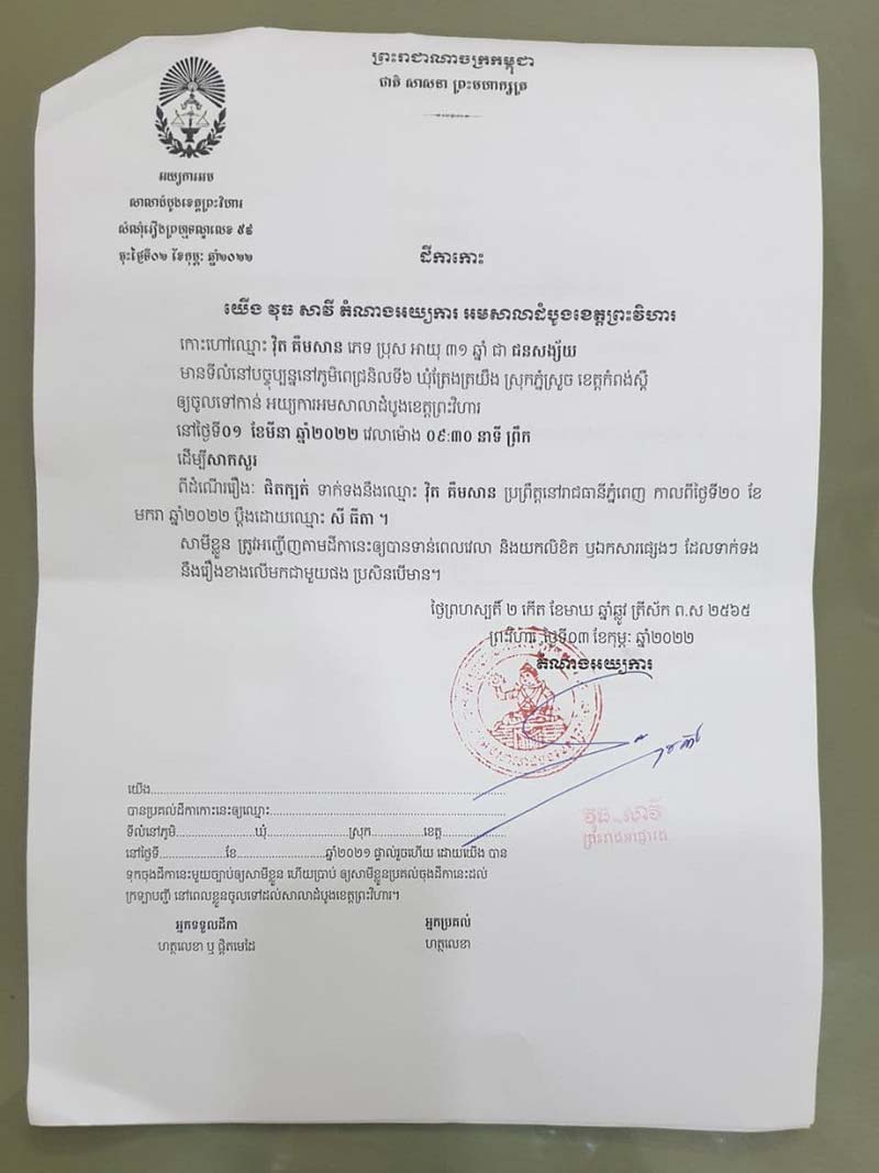 ដោយឡែកនៅថ្ងៃទី៣ខែកុម្ភៈឆ្នាំ២០២២ តំណាងអយ្យការអមសាលាដំបូងខេត្តព្រះវិហារ លោក វុធសាវី ព្រះរាជអាជ្ញារងនិងជាអ្នកនាំពាក្យអមសាលាដំបូងខេត្តព្រះវិហារ ក៏បានចេញដីកាកោះហៅអតីតប្តីឲ្យចូលខ្លួនមកបំភ្លឺ លើករណីបណ្តឹងរបស់អតីតប្រពន្ធ ដែលបានប្តឹងពីបទផិតក្បត់ចោលប្រពន្ធនិងកូនទៅរៀបការជាមួយស្រីថ្មីនៅថ្ងៃ ទី១ ខែមិនា ឆ្នាំ២០២២ខាងមុខនេះ។