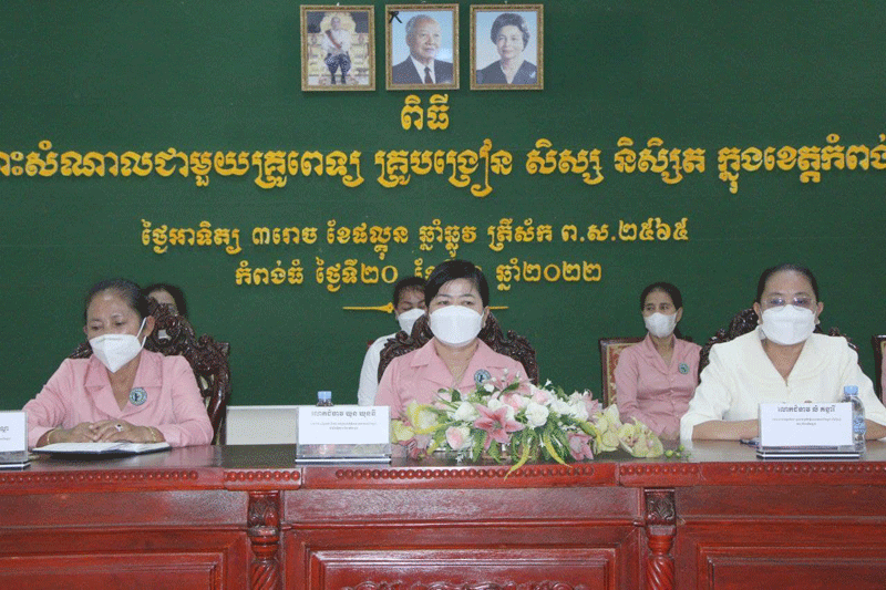 កំពង់ធំ÷ នៅរសៀលថ្ងៃទី២០ខែមីនា ឆ្នាំ២០២២ លោកជំទាវ ឃួន ឃុនឌី សមាជិកព្រឹទ្ធសភា ជាអនុប្រធានកិត្តិយសគណៈកម្មការសាខាសមាគមនារីខេត្ត លោកជំទាវ លឹម ផល្លា សមាជិករដ្ឋសភា ជាអនុប្រធានកិត្តិយសគណៈកម្មការសាខាសមាគមនារីខេត្ត លោកជំទាវ លំ គន្ធារី អភិបាលរងខេត្ត ជាប្រធានគណៈកម្មការសាខាសមាគមនារីខេត្ត អញ្ជើញជាអធិបតីភាពក្នុង ពិធីសំណេះសំណាលជាមួយគ្រូពេទ្យ គ្រូបង្រៀន សិស្ស/និស្សិត ក្នុងខេត្តកំពង់ធំនៅសាលាខេត្តកំពង់ធំ។