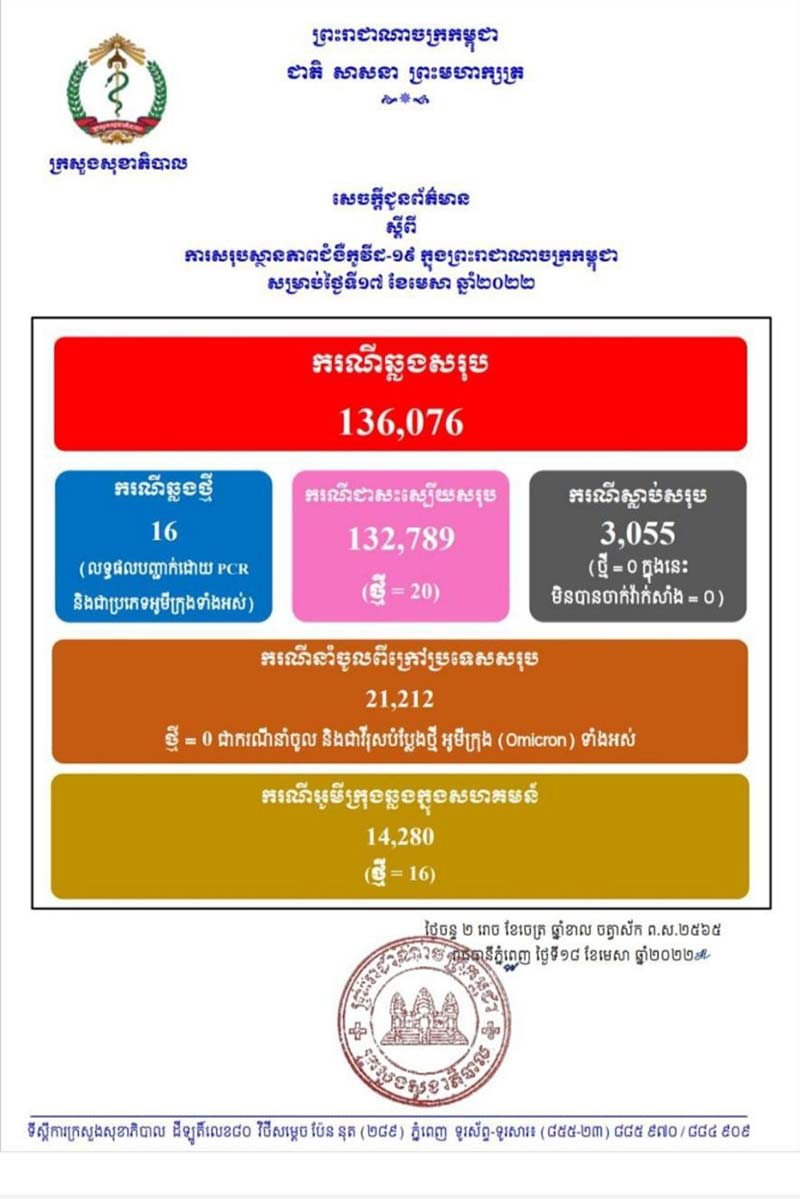 ក្នុងរបាយការណ៍បានបញ្ជាក់ នៅថ្ងៃទី១៨ ខែមេសា ឆ្នាំ២០២២ថា រហូតមកទល់ពេលនេះ កម្ពុជាមានអ្នកឆ្លងជំងឺកូវីដ-១៩សរុបចំនួន ១៣៦.០៧៦នាក់ ,ជាសះស្បើយសរុបចំនួន ១៣២.៧៨៩នាក់ និងករណីស្លាប់សរុបចំនួន ៣.០៥៥នាក់ ៕SKS