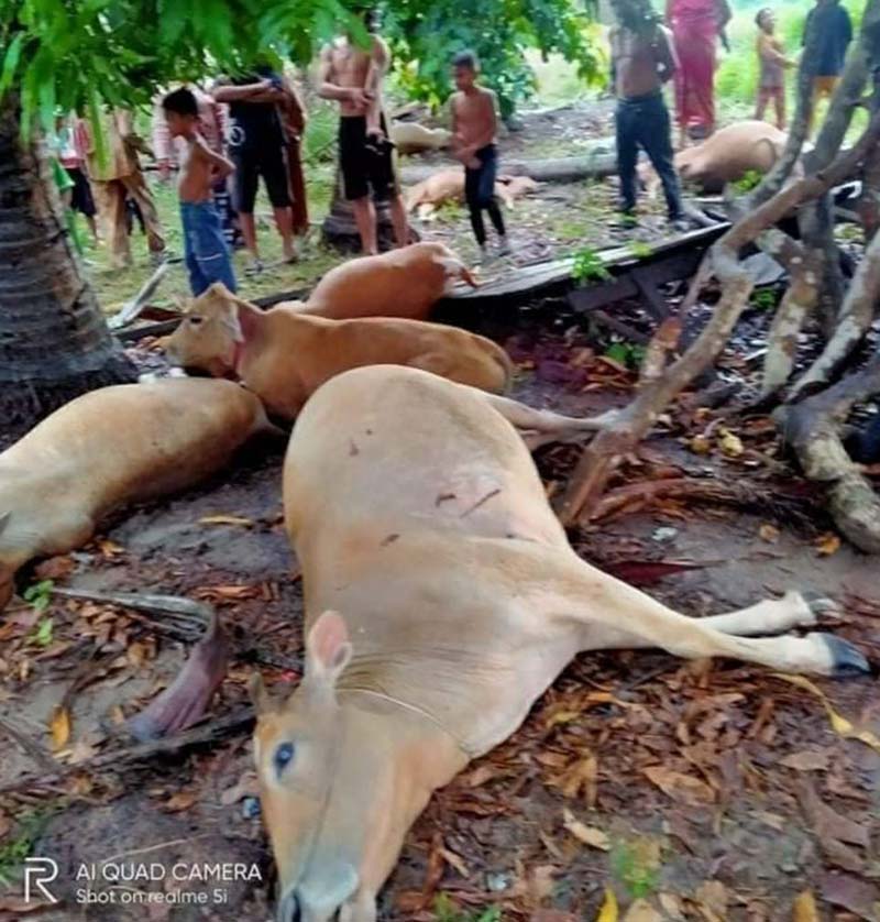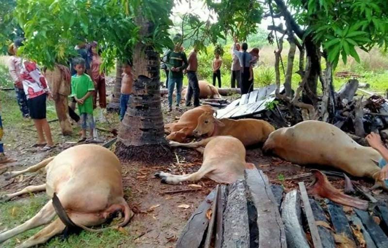 កំពង់ធំ៖ នៅរសៀលថ្ងៃទី២៦ ខែមេសា ឆ្នាំ២០២២ វេលាម៉ោង១៦និង១៧នាទី នៅភូមិវាលល្ពាក់ចាស់ ឃុំសាលាវិស័យ ស្រុកប្រាសាទបល្ល័ង្ក ខេត្តកំពង់ធំ មានករណីរន្ទះបាញ់បណ្តាលឱ្យស្លាប់សត្វគោចំនួន៨ក្បាលខណ:មេឃកំពុងតែភ្លៀងមួយមេ និងរបួសសត្វគោ១ក្បាល ដែលបណ្ដាលមកពីគ្រោះធម្មជាតិ។