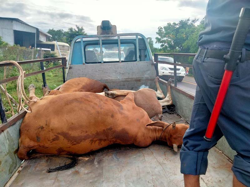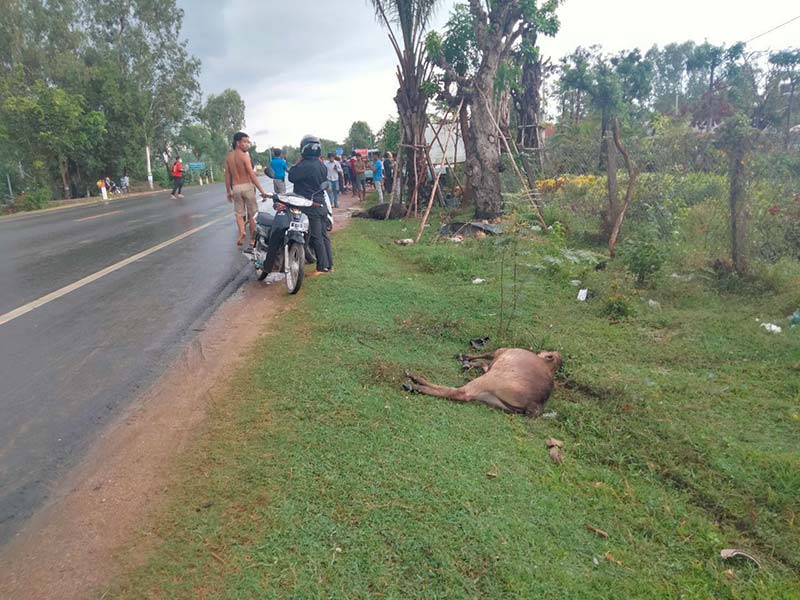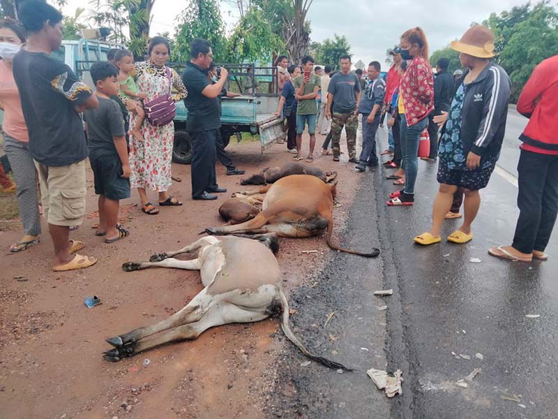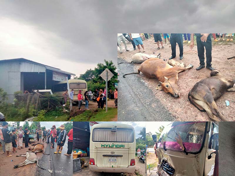 ខេត្តស្វាយរៀង៖សត្វគោញីឈ្មោលចំនួន៧ក្បាលបានងាប់ភ្លាមៗនៅកន្លែងកើតហេតុគួរឲ្យរន្ធត់ខណៈហ្វូងសត្វគោទាំងនោះបានដើរឆ្លងថ្នល់ហើយក៏ត្រូវរថយន្តដឹកកម្មកររោងចក្របើកបុកទាំងកំរោល ។