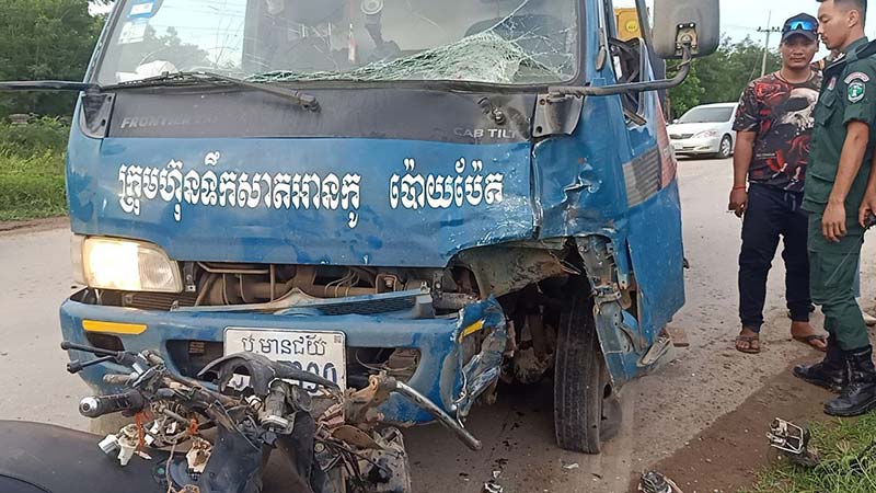 បន្ទាយមានជ័យ៖ បុរសម្នាក់បើកម៉ូតូវ៉ាជេងរថយន្តមួយគ្រឿងជ្រុកទៅបុករថយន្តបញ្ជ្រាស់ទិសមួយគ្រឿងទៀតបណ្តាលឲ្យបាក់ជើងបែកក្បាលស្លាប់ នៅនឹងកន្តែង ហេតុការណ៍នេះបានកើតឡើងនៅវេលាម៉ោង៥.៤០នាទី ថ្ងៃទី២២ ខែឧសភា ឆ្នាំ២០២២ នៅតាមបណ្តោយផ្លូវជាតិលេខ៥ មុខផ្លូវចូលរម្មណីយ៍ដ្ឋានអាងអូរខៃដន នៅក្នុងភូមិអណ្តូងថ្មមាស សង្កាត់និមិត្ត ក្រុងប៉ោយ៉ប៉ែត។