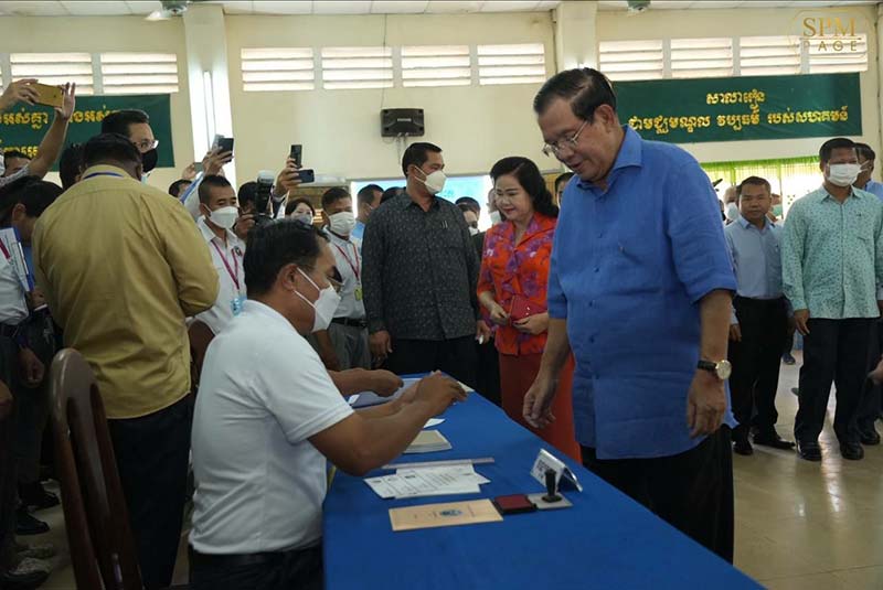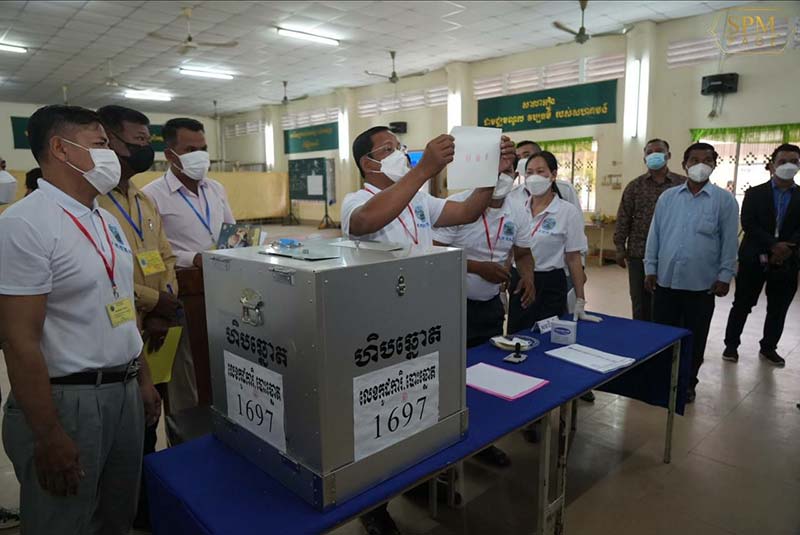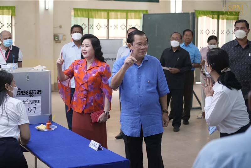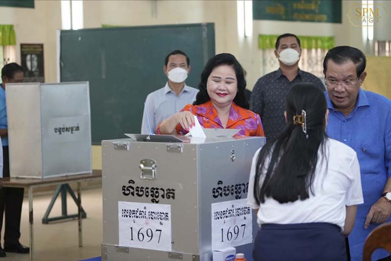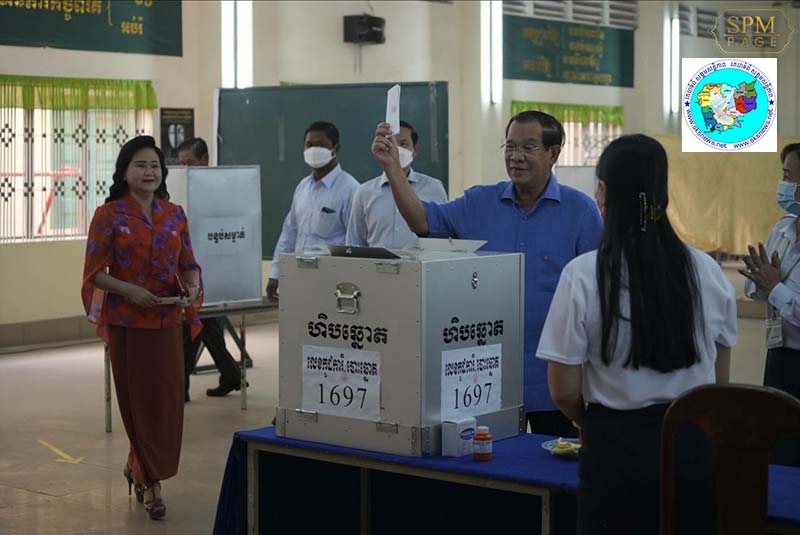 ភ្នំពេញៈ នៅព្រឹក ថ្ងៃអាទិត្យ ៦កើត ខែជេស្ឋ ឆ្នាំខាល ចត្វាស័ក ព.ស. ២៥៦៦ ត្រូវនឹងថ្ងៃទី៥ ខែមិថុនា ឆ្នាំ២០២២ នេះ សម្តេចអគ្គមហាសេនាបតីតេជោ ហ៊ុន សែន នាយករដ្ឋមន្ត្រីនៃព្រះរាជាណាចក្រកម្ពុជា និងសម្តេចកិត្តិព្រឹទ្ធបណ្ឌិត ប៊ុន រ៉ានី ហ៊ុនសែន បានអញ្ជើញទៅចូលរួមបោះឆ្នោតនៅសាលាគរុកោសល្យ និងវិក្រឹត្យការក្រុងតាខ្មៅ ខេត្តកណ្តាល។