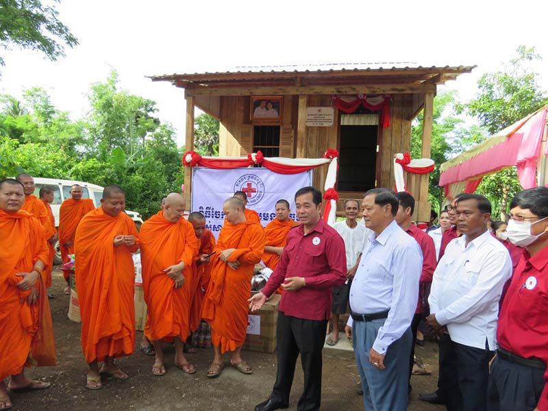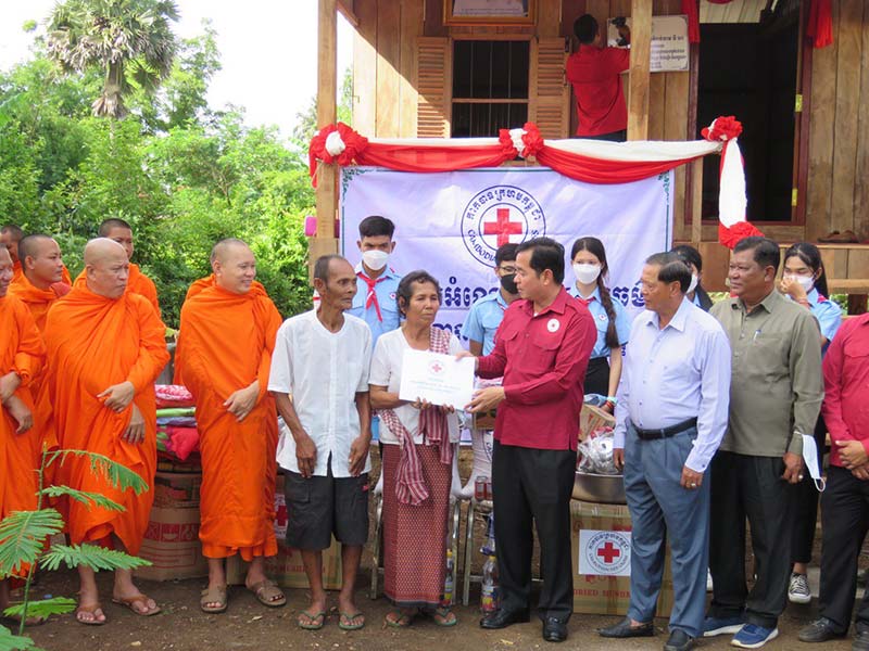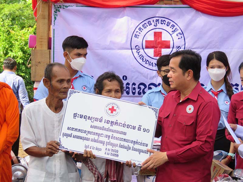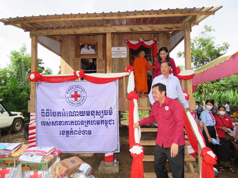 កំពង់ចាម : ឯកឧត្តម អ៊ុន ចាន់ដា អភិបាលខេត្តកំពង់ចាម និងជាប្រធានគណៈកម្មាធិការសាខា កាកបាទក្រហម ខេត្ត ដោយ មានការនិមន្ត និង អញ្ជើញចូលរួមពីព្រះមន្ត្រីសង្ឃ និង មន្ត្រី រាជការ នាព្រឹក ថ្ងៃទី៨ ខែមិថុនា ឆ្នាំ ២០២២ នេះ បានប្រគល់ផ្ទះមនុស្សធម៌ទី១០ ជូនជនចាស់ជរាទ័លលំបាក ១គ្រួសារ ឈ្មោះ ចន ព្រុំ អាយុ៨៧ឆ្នាំ រស់នៅ ភូមិអន្លង់ស្នូក ឃុំអូរស្វាយ ស្រុកកំពង់សៀម ខេត្តកំពង់ចាម ។