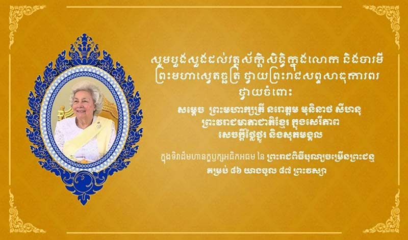 សូមលើកហត្ថប្រណមបួងសួងដល់ព្រះរតនៈត្រយ័ វត្ថុសក្តិសិទ្ឋក្នុងលោក ទេវតាថែរក្សាស្វេតឆត្រ័នឹងព្រះវិញ្ញានក្ខន័ដ៍មានបារមីនៃអតិតៈព្រះមហាក្ស័ត្រ នឹងព្រះមហាក្សត្រីខ្មែរ នៅក្នុងឱកាសដ៏មហានក្ខត្តឫក្ស ឧត្តុង្គឧត្តមប្រសើរថ្លៃថ្លា ប្រកបដោយក្តី សោមនស្សរីករាយ នៃព្រះរាជពិធីបុណ្យចម្រើនព្រះជន្មគម្រប់ ៨៦ព្រះវស្សា យាងចូល ៨៧ព្រះវស្សា របស់សម្តេចព្រះមហាក្សត្រី នរោត្តម មុនិនាថ សីហនុ ព្រះវររាជមាតាជាតិខ្មែរ ដែលប្រព្រឹត្តទៅនៅថ្ងៃទី១៨ ខែមិថុនា ឆ្នាំ២០២២នេះ ទូលព្រះបង្គំសូមព្រះបរមរាជានុញ្ញាតអភិវន្ទ សម្តែងថ្វាយនូវអំណរសាទរឥតឧបមា និងចូលរួមថ្វាយនូវព្រះសព្ទសាធុការពរជ័យ បវរសួស្តី សិរីវឌ្ឍនា វិបុលសុខមហាប្រសើរគ្រប់ប្រការចំពោះ សម្តេចព្រះមហាក្សត្រី ព្រះវររាជមាតាជាតិខ្មែរ ជាទីគោរពសក្ការៈដ៏ខ្ពង់ខ្ពស់បំផុត និងសូមព្រះអង្គទ្រង់ប្រកបដោយព្រះរាជបញ្ញាញាណភ្លឺថ្លា ព្រះកាយពលរឹងមាំ គង់ប្រថាប់ជាម្លប់ដ៏ត្រជាក់ត្រជុំ ដល់ប្រជានុរាស្រ្តទូទាំងប្រទេស ជាអង្វែងតរៀងទៅ៕