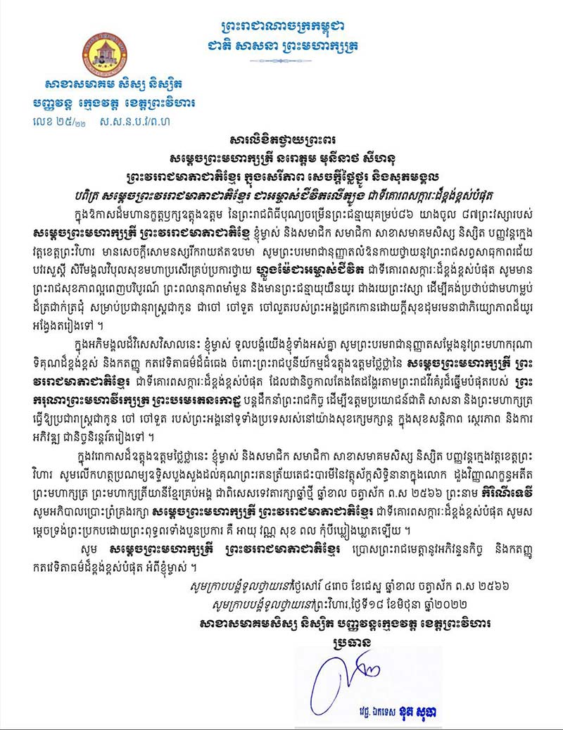 ព្រះវិហារៈ ទូលព្រះបង្គំជាកូន ជាចៅ ជាចៅទូត សាខាសមាគមសិស្ស និស្សិតបញ្ញវន្ត ក្មេងវត្ត ខេត្តព្រះវិហារ រួមនិងប្រជានុរាស្រ្តខ្មែរទូទាំងប្រទេស