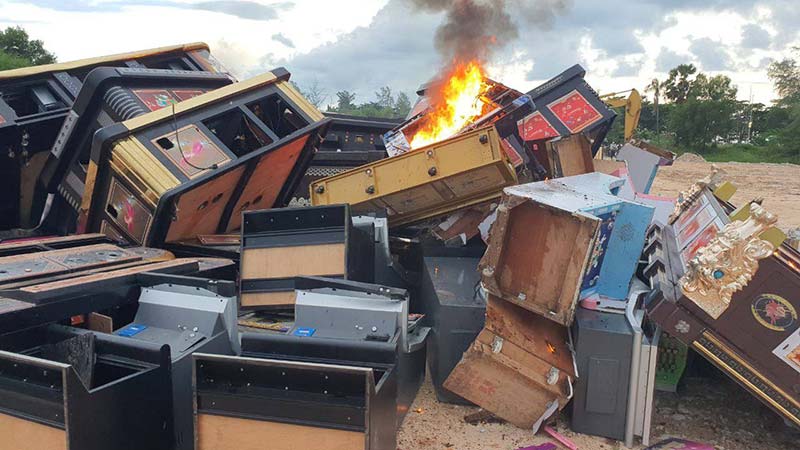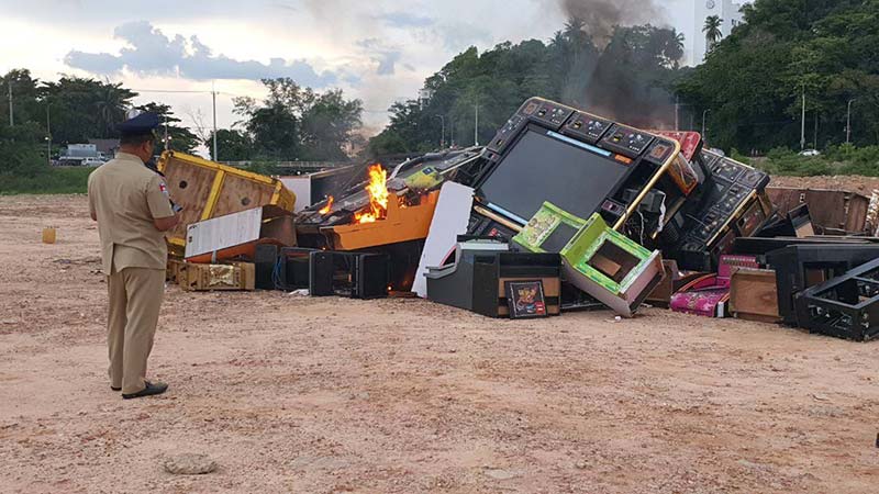 កម្លាំងជំនាញ នៃការិយាល័យនគរបាលព្រហ្មទណ្ឌកម្រិតធ្ងន់ បានសហការជាមួយកម្លាំងជំនាញនៃអធិការដ្ឋាននគរបាលក្រុងព្រះសីហនុ ប្រមូលឧបករណ៍ហ្គេមអេឡិចត្រូនិកខុសច្បាប់ ដែលបង្ក្រាបបានចាប់ពីអំឡុងខែមករា ដល់ខែមិថុនា ឆ្នាំ២០២២ នេះចំនួន ១០ទីតាំង មកធ្វើការដុតកំទិចចោល នៅទីតាំងដី បឹងព្រែកទប់ ស្ថិតក្នុងភូមិ១ សង្កាត់៣ ក្រុង-ខេត្តព្រះសីហនុ ។