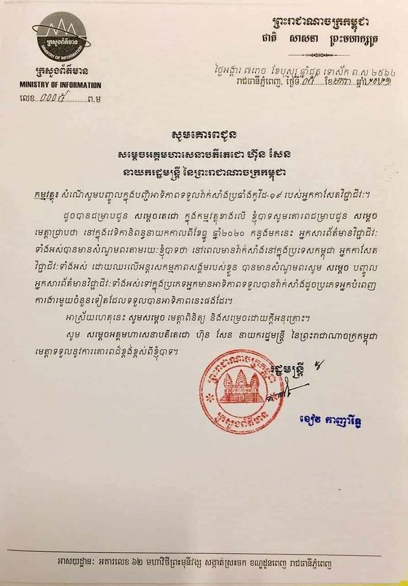 សម្តេច តេ ជោ ហ៊ុន សែន បាន បញ្ជាក់ថា ៖« សូមឱ្យ ក្រសួងសុខាភិបាល ចាត់ទុក ក្រុម អ្នកដើរ យក ព័ត៌មាន នេះ ជា ក្រុម ដែល ត្រូវ បានទទួល វ៉ាក់សាំង ព្រោះ ពួកគេ រុករក គ្រប់ ទីក ន្លែង ទាំងអស់ មិនដឹងថា ទៅ ទីកន្លែង ណាខ្លះ ទេអញ្ចឹង ខ្ញុំ សូមអ្នក សារព័ត៌មាន ទាំងអស់ ដែលមាន អាយុ ត្រឹម ៥៩ ឆ្នាំ ចុះមក ទទួល វ៉ាក់សាំង » ។