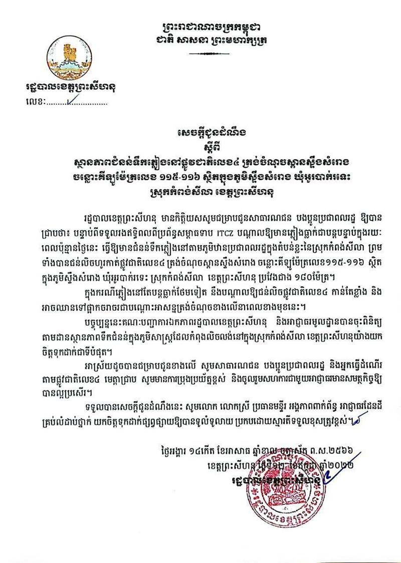 រដ្ឋបាលខេត្តព្រះសីហនុ មានកិត្តិយសសូមជម្រាបជូនសាធារណជន បងប្អូនប្រជាពលរដ្ឋ ឱ្យបានជ្រាបថា៖ បន្ទាប់ពីទទួលរងឥទ្ធិពលពីប្រព័ន្ធសម្ពាធទាប ITCZ បណ្តាលឱ្យមានភ្លៀងធ្លាក់ជាបន្តបន្ទាប់ក្នុងរយៈពេលប៉ុន្មានថ្ងៃនេះ ធ្វើឱ្យមានជំនន់ទឹកភ្លៀងនៅតាមភូមិឋានប្រជាពលរដ្ឋក្នុងតំបន់ខ្លះនៃស្រុកកំពង់សីលា ព្រមទាំងបានជន់លិចហូរកាត់ផ្លូវជាតិលេខ៤ ត្រង់ចំណុចស្ពានស្ទឹងសំរោង ចន្លោះគីឡូម៉ែត្រលេខ១១៥-១១៦ ស្ថិតក្នុងភូមិស្ទឹងសំរោង ឃុំអូរបាក់រទេះ ស្រុកកំពង់សីលា ខេត្តព្រះសីហនុ ប្រវែងជាង ១៨០ម៉ែត្រ។