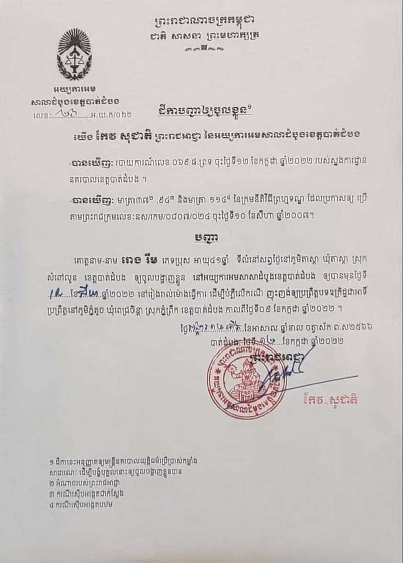 ដោយឡែក មេក្លោងជាដែលជាមន្ដ្រីយោធាឈ្មោះ រោង សារឹម មានតួនាទីជាមេបញ្ជាការរងតំបន់ប្រតិបត្តិការសឹករងខេត្តបាត់ដំបង តុលាការកំពុងចេញដីកាដើម្បីឲ្យកម្លាំងសមត្ថកិច្ចកំពុងស្រាវជ្រាវចាប់ខ្លួន ចាត់ការបន្ដតាមនីតិវិធី ពាក់ព័ន្ធការប្រព្រឹត្តល្មើសច្បាប់។ នេះបើតាមការឲ្យដឹងពីលោកព្រះរាជអាជ្ញា កែវ សុជាតិ។