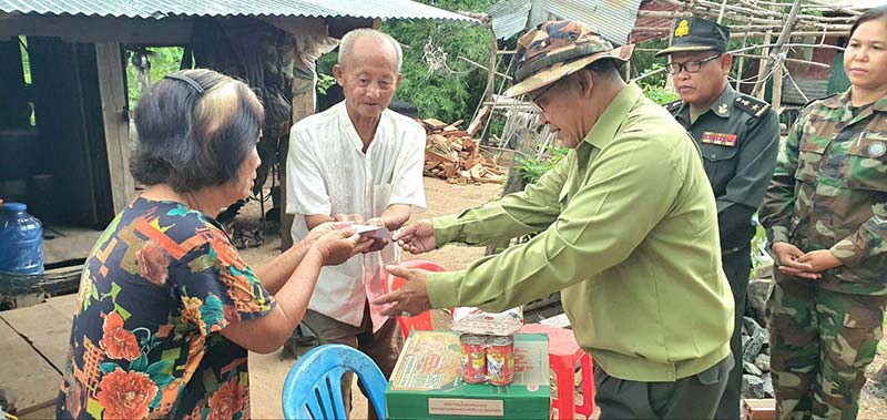 ទន្ទឹមនោះដែរ ឯកឧត្ដម មេបញ្ជាការបានពាំនាំប្រសាសន៍ផ្ដាំផ្ញើរសួសុខទុកពីសំណាក់ ឯកឧត្ដម មេបញ្ជាការកងទ័ពជើងគោក និងលោកជំទាវ ព្រមទាំងជូនពរឲ្យលោកយាយ លោកតា មានសុខភាពល្អបរិបូរ។ គ្រួសារដែលបានចុះសួសុខទុក្ខរួមមាន ៖ ១.លោក តា ម៉ៅ សីហៈ អាយុ៨០ឆ្នាំ និងលោកយាយ កុក ឈុនហេង អាយុ៦៥ឆ្នាំ រស់នៅពីនាក់តានិងយាយ ទទួលបានអំណោយរួមមាន ៖ ១.អង្ករ ១ប៉េ ស្មើ៣០គីឡូក្រាម/២.មុីម៉ាម៉ា ១កេស/៣.ត្រីខ ១យួរ/៤.ទឹកសុទ្ធ ១កេស/៥.ប៊ីចេង ១កញ្ចប់/និងថវិការចំនួន ១០០,០០០រៀល។គ្រួសារទី២.លោកតា សៀង គឹមសេង អាយុ៧៧ឆ្នាំ ពិការភ្នែក និងលោកយាយ ឃាង ដានី អាយុ៧២ឆ្នាំ រស់នៅពីនាក់តានិងយាយ ទទួលបានអំណោយរួមមាន៖ ១.អង្ករ ២ប៉េ ស្មើ៦០គីឡូក្រាម/២.មុីម៉ាម៉ា ១កេស/៣.ត្រីខ ១យួរ/៤.ទឹកសុទ្ធ ១កេស/៥.ប៊ីចេង ១កញ្ចប់/និងថវិការចំនួន ១០០,០០០រៀលផងដែរ៕