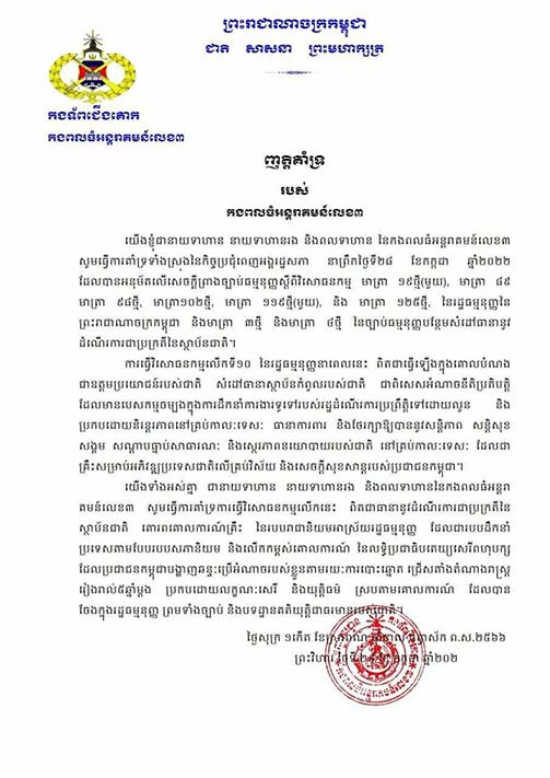 ព្រះវិហារៈ កងពលធំអន្តរាគមន៍លេខ៣ កងទ័ពជើងគោក នៅថ្ងៃទី៣០ ខែកក្កដា ឆ្នាំ២០២២នេះ បានចេញញត្តិប្រកាសគាំទ្រទាំងស្រុងចំពោះ ការធ្វើវិសោធនកម្មរដ្ឋធម្មនុញ្ញ លើកទី១០ របស់កម្ពុជា។