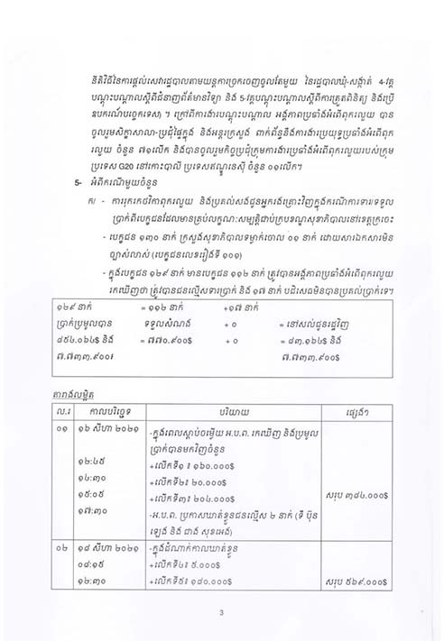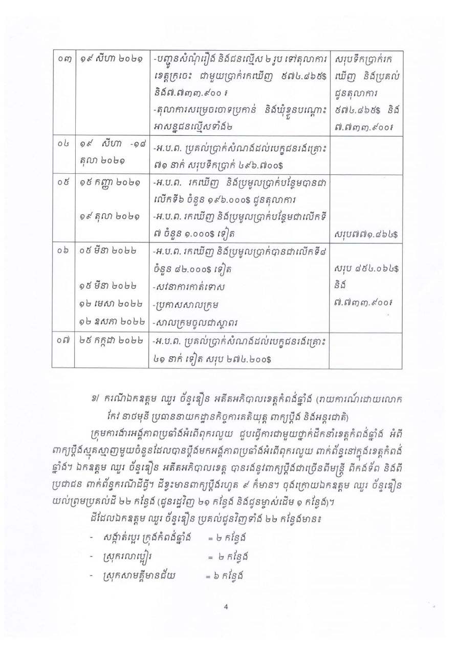 លោកទេសរដ្ឋមន្ត្រីឱម យ៉ិនទៀង បានបន្តថា កាលពីថ្ងៃទី១៦ដល់ទី១៨ខែសីហា ឆ្នាំ២០២១ ACU រកឃើញប្រាក់ ៥៦ម៉ឺនដុល្លារ និងប្រាក់រៀល ៣៨ ម៉ឺន៤ពាន់រៀល។ បន្ទាប់ពីឃាត់ខ្លួនជនជាប់ចោទ កាល ពីថ្ងៃទី១៩ខែសីហាឆ្នាំ ២០២១ បញ្ជូនទៅតុលាការ រកឃើញប្រាក់៥៧ម៉ឺន ៤ពាន់៨៦៤ដុល្លារ និងប្រាក់រៀល។ ថ្ងៃទី១៩សីហាដល់១៨កញ្ញា ២០២១ ACU បានប្រគល់ប្រាក់ដល់ជនរងគ្រោះចំនួន៧១នាក់ សរុបទឹកប្រាក់ចំនួន៤៩ម៉ឺន៦ពាន់៧០០ដុល្លារ ហើយចាប់ពីថ្ងៃទី១៥ខែកញ្ញាដល់ ១៩ខែតុលា២០២១ បានរកឃើញប្រាក់ចំនួន៧៧ម៉ឺន១ពាន់៨៦៤ដុល្លារទៀត។