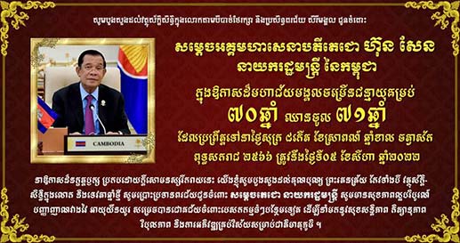 សញ្ចេតនាសោមនស្សរីករាយឥតឧបមា សូមគោរពជូនពរជ័យ សិរីមង្គល វិបុលសុខ មហាប្រសើរជូនចំពោះ សម្តេចតេជោនាយករដ្ឋមន្រ្តី សូមមានសុខភាពល្អបរិបូរណ៍ កម្លាំងពលំខ្លាំងក្លា និងជន្មាយុជាងរយព្រះវស្សា ។