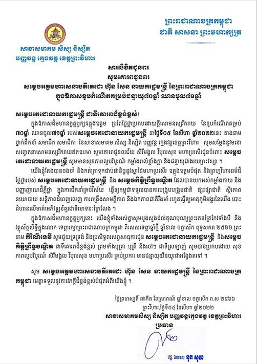 ព្រះវិហារៈ ក្នុងឱកាសដ៏មហានក្ខត្តឫក្សឧត្តុងឧត្តម ប្រពៃថ្លៃថ្លាប្រកបដោយក្តីសោមនស្សរីករាយ នៃខួបកំណើតគម្រប់៧០ឆ្នាំ ឈានចូល៧១ឆ្នាំ របស់សម្តេចតេជោនាយករដ្ឋមន្រ្តី នាថ្ងៃទី០៥ ខែសីហា ឆ្នាំ២០២២នេះ តាងនាមថ្នាក់ដឹកនាំ សមាជិក សមាជិកា នៃសាខាសមាគម សិស្ស និស្សិត បញ្ញវន្ត ក្មេងវត្តខេត្តព្រះវិហារ សូមសម្តែងនូវមនោ