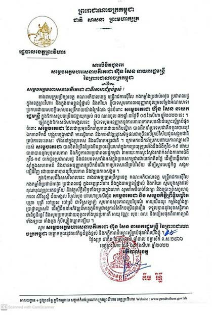 ព្រះវិហារៈ ឯកឧត្តម គីម រិទ្ធី អភិបាលខេត្តព្រះវិហារ ព្រមទាំងមន្រ្តីរាជការ កងកម្លាំងប្រដាប់អាវុធ និងប្រជាពលរដ្ឋទាំងអស់ បានផ្ញើសារលិខិតគោរពជូនពរ សម្ដេចតេជោ ហ៊ុន សែន នាយករដ្ឋមន្ត្រីនៃកម្ពុជា ក្នុងឱកាសដ៏មង្គលសួស្ដីប្រពៃថ្លៃថ្លា ចម្រើនជន្មាយុគម្រប់ ៧០ ឈានចូល ៧១ឆ្នាំ។