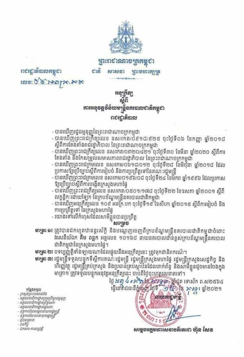 ការចេញអនុក្រឹត្យសម្រេចដកស័ក្តិ និងបណ្តេញលោកវរសេនីយ៍ឯក គឹម ពន្លក អធិការស្រុកកំរៀង ខេត្តបាត់ដំបង ចេញពីក្របខណ្ឌមន្ត្រីនគរបាលជាតិ ធ្វើឡើងបន្ទាប់ពីមានបញ្ជារបស់សម្តេចតេជោ ហ៊ុន សែន នាយករដ្ឋមន្ត្រីនៃកម្ពុជា នៅរសៀលថ្ងៃទី១៥ ខែកុម្ភៈ ឆ្នាំ២០២១ បន្ទាប់ពីក្រុមស្រាវជ្រាវរកឃើញថា អធិការស្រុករូបនេះ ពិតជាបានដោះលែងមេខ្យល់នាំមនុស្សឆ្លងដែនខុសច្បាប់ ពីប្រទេសថៃចូលទឹកដីកម្ពុជា។ ក្រៅពីបកស័ក្តិ និងបណ្តេញចេញពីក្របខណ្ឌ សម្តេចបានបញ្ជាឲ្យអភិបាលខេត្ត និងអគ្គស្នងការនគរបាលជាតិ ត្រូវបន្តចាត់ការអនុវត្តតាមផ្លូវច្បាប់ទៀត ដើម្បីផ្តន្ទាទោសជនពុករលួយរូបនេះ ដាក់ពន្ធនាគារឲ្យខាងតែបាន ដើម្បីជាការព្រមានដល់ជនទាំងឡាយផ្សេងទៀត កុំឲ្យប្រព្រឹត្តទង្វើបែបនេះ។តាមព័ត៌មានបានឲ្យដឹងថា លោកវរសេនីយ៍ឯក គឹម ពន្លក បានទទួលស្គាល់ថា ខ្លួនពិតជាបានទទួលមុខសញ្ញាមេខ្យល់នាំមនុស្ស ឆ្លងដែនខុសច្បាប់ពីកម្លាំងវរៈការពារព្រំដែន-៨១៩ ករណីទីមួយគឺមុខសញ្ញាផ្តល់ជំរកស្នាក់នៅដល់ពលករ ដើម្បីត្រៀមឆ្លងដែនខុសច្បាប់ពីកម្ពុជាទៅថៃ និងករណីទីពីរគឺមុខសញ្ញាពាក់ព័ន្ធនាំពលករឆ្លងដែនខុសច្បាប់ពីថៃចូលកម្ពុជា គេចពីការធ្វើចត្តាឡីស័ក ប្រាកដមែន។សូមជំរាបថា នៅព្រឹកថ្ងៃទី១៥ ខែកុម្ភៈ ឆ្នាំ២០២១នេះ ស្នងការដ្ឋាននគរបាលខេត្តបាត់ដំបង បានចេញសេចក្តីសម្រេចផ្អាកការងារបណ្តោះអាសន្នចំពោះ លោកវរសេនីយ៍ឯក គឹម ពន្លក អធិការនគរបាលស្រុកកំរៀង៕