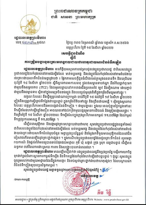 នេះបើយោងតាមសេចក្តីជូនដំណឹងដែលអង្គភាពព័ត៌មាន (សង្គមសន្តិភាព) ទទួលបាននៅព្រឹកថ្ងៃទី១៦ ខែសីហា ឆ្នាំ២០២២នេះ រដ្ឋបាលខេត្តព្រះវិហារ បានអំពាវនាវដល់ប្រជាពលរដ្ឋក្នុងខេត្តទាំងអស់ ជាពិសេសប្រជាពលរដ្ឋដែលកំពុងរស់នៅ តាមដងស្ទឹងសែន មាត់ទន្លេមេគង្គ និងប្រជាពលរដ្ឋដែលកំពុងរស់នៅតាមតំបន់ងាយរងគ្រោះ ដោយសារទឹកជំនន់មួយចំនួន មេត្តាប្រុងប្រយ័ត្នខ្ពស់ និងស្វែងរកទីទួលមានសុវត្ថិភាពដែលនៅជិត ចៀសវាងកើតឡើងនូវគ្រោះថ្នាក់ផ្សេងៗ។