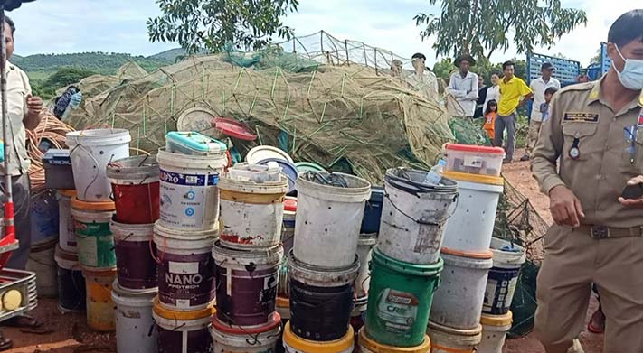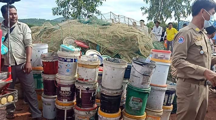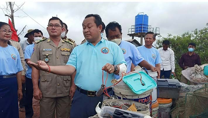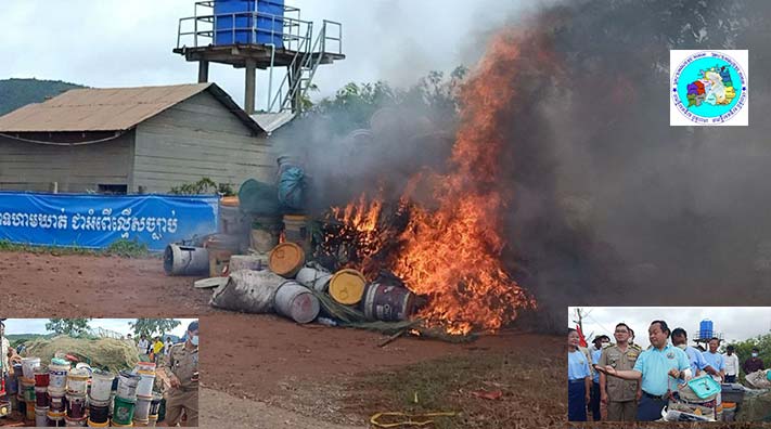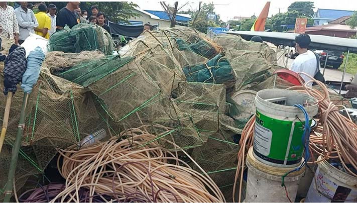 កែប : ឧបករណ៍ នេសាទខុសច្បាប់ នៅស្រុកដំណាក់ចង្អើរ នៅព្រឹកថ្ងៃទី១៧ សីហានេះ ត្រូវបានអាជា្ញធរដុតកម្ទេចចោល បន្ទាប់ពីបង្រ្កាបកាលពីពេលកន្លងទៅ ។