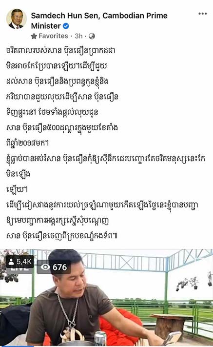 ភ្នំពេញ៖ នៅថ្ងៃទី២២ ខែសីហា ឆ្នាំ២០២២នេះ នាយឧត្តមសេនីយ៍ វង្ស ពិសេន អគ្គមេបញ្ជាការនៃកងយោធពលខេមរភូមិន្ទ បានចេញសេចក្ដីសម្រេចលុបឈ្មោះ អនុសេនីយ៍ឯក ហ៊ត ប៊ូ ចេញពីក្របខ័ណ្ឌកងយោធពលខេមរភូមិន្ទ និងបានធ្វើលិខិតមួយច្បាប់ទៀត គោរពជូនសម្ដេចពិជ័យសេនា ទៀ បាញ់ ឧបនាយករដ្ឋមន្ត្រី រដ្ឋមន្ត្រីក្រសួងការពារជាតិ ស្នើលុបឈ្មោះ វរសេនីយ៍ត្រី សាន្ត ប៊ុនធឿន ចេញពីក្របខ័ណ្ឌកងយោធពលខេមរភូមិន្ទ ។