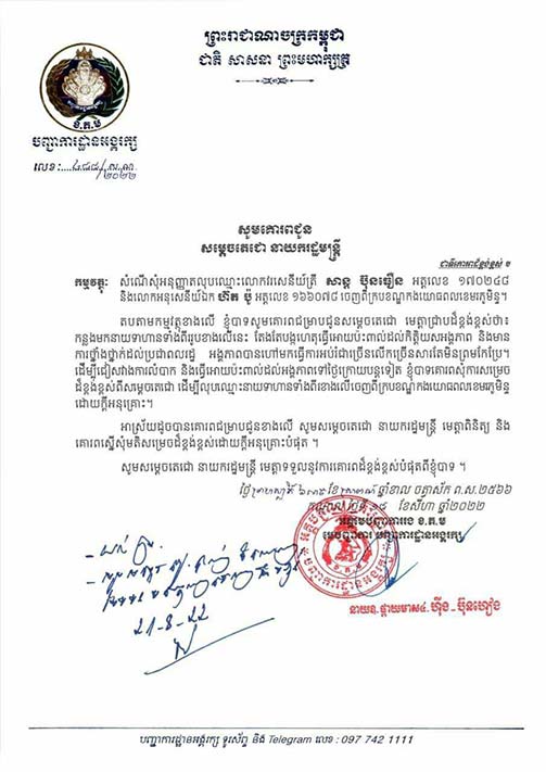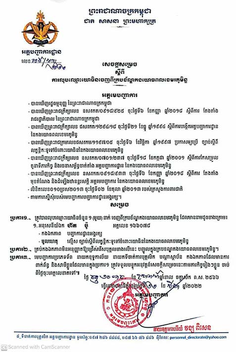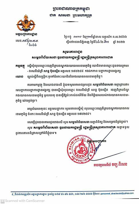 ការចេញសេចក្តីសម្រេច និងលិខិតស្នើសុំលុបឈ្មោះចេញពីក្របខ័ណ្ឌយោធិនពីររូបនេះ បន្ទាប់ពីមានសំណើរបស់បញ្ជាការដ្ឋានអង្គរក្ស គោរពជូនសម្តេចតេជោ ហ៊ុន សែន នាយករដ្ឋមន្ត្រីនៃកម្ពុជា និងចំណារឯកភាពរបស់សម្ដេចតេជោ ស្នើទៅរដ្ឋមន្ត្រីក្រសួងការពារជាតិឲ្យបំពេញបែបបទបណ្តេញចេញជាបន្ទាន់ដោយសារពួកគេធ្វើឲ្យប៉ះពាល់ដល់វិន័យនិងកិត្តិយសរបស់កងយោធពលខេមរភូមិន្ទ ធ្ងន់ធ្ងរ៕