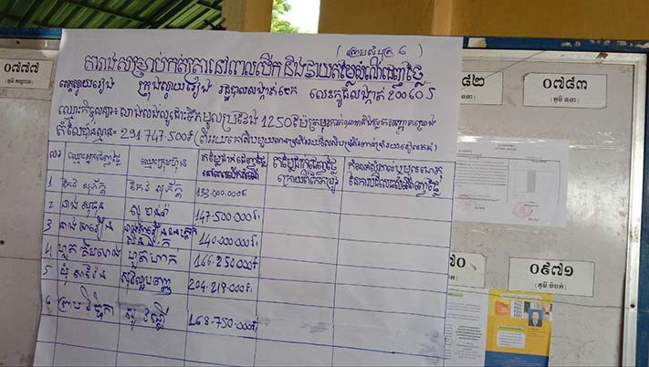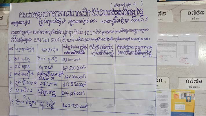 ទី៥,សង្កាត់ពោធិតាហោ កិច្ចសន្យាគម្រោងសាងសង់ផ្លូវដី ក្រាលបេតុងអាមេ ប្រវែង២៤២ម៉ែត្រ ទទឹង០៥ម៉ែត្រ កម្រាស់០,១៥ម៉ែត្រ តម្លៃប៉ាន់ស្មាន ១០៦,០៣៩,៨០០រៀល មានក្រុមហ៊ុនចូលដាក់ដេញថ្លៃ០៨ក្រុមហ៊ុន លទ្ធផលបានទៅលើក្រុមហ៊ុន សុគុន្ធសម្បត្តិ ៥៥៥ ឯក អ្នកចូលដេញថ្លៃ ឈ្មោះ ចៅ ស្រី ពេជ ដាក់តម្លៃ ៦១,៩៥២,០០០រៀល ដាក់តម្លៃទាបអាចទទួលយកបាន។ចំណែក ការដេញថ្លៃនៅសង្កាត់សង្ឃ័រ និងសង្កាត់គយត្របែក ក៏មានការដេញថ្លៃបែបប្រកាប់ប្រាក់គ្នាដែរអ្នកដេញថ្លៃនិយាយថា គម្រោងបែក គឺដេញថ្លៃដាក់ទាបក្រោម៥០%ដែរ។