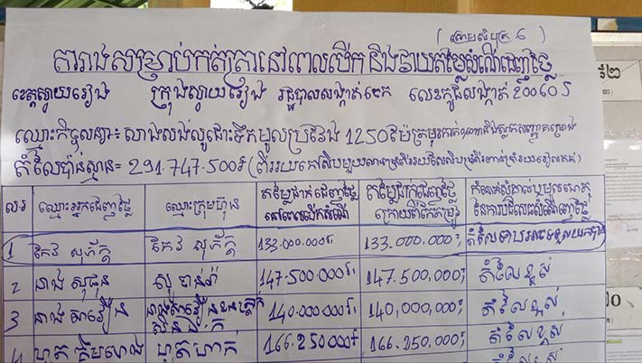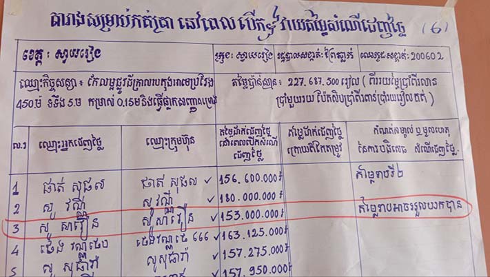 ទី១,សង្កាត់ស្វាយរៀង ដាក់ដេញថ្លៃកិច្ចសន្យា គម្រោង សាងសង់លូមូលរំដោះទឹកប្រវែង១,០០០ម៉ែត្រ មុខកាត់០,៦០ម៉ែត្រ និងស្លាកគម្រោង១ តម្លៃប៉ាន់ស្មាន ២៣៣,៩២៤,០០០រៀល មានក្រុមហ៊ុនដាក់ដេញថ្លៃចំនួន៥ក្រុមហ៊ុន លទ្ធផលបានទៅលើក្រុមហ៊ុនសូ សាវឿន អ្នកចូលដេញថ្លៃឈ្មោះ សូ ចាន់ដា ដាក់តម្លៃ១២០,០០០,០០០រៀល តម្លៃទាបអាចទទួលយកបាន។