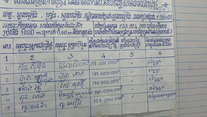 ទី២,សង្កាត់ព្រៃឆ្លាក់ គម្រោងកែលម្អ ផ្លូវក្រាលបេតុងអាមេ ប្រវែង៤៥០ម៉ែត្រ ទទឹង៥ម៉ែត្រ កម្រាស់០,១៥ម៉ែត្រ និងធ្វើស្លាកគម្រោង១។តម្លៃប៉ាន់ស្មាន២២៧,៦៨៧,៥០០រៀល មានក្រុមហ៊ុនចូលដាក់ដេញថ្លៃចំនួន០៦ក្រុមហ៊ុន លទ្ធផល បានទៅលើក្រុមហ៊ុន សូ សាវឿន អ្នកដេញថ្លៃ ឈ្មោះសូ សាវឿន ដាក់ ១៥៣,០០០,០០០រៀល