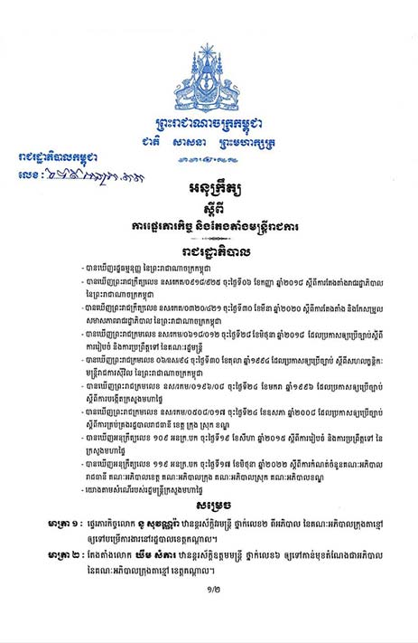យោងតាមអនុក្រឹត្យ ចុះហត្ថលេខាដោយ សម្តេចតេជោប្រមុខរាជរដ្ឋាភិបាលកម្ពុជា នៅថ្ងៃទី២២ ខែសីហានេះ បានសម្រេចផ្ទេរភារកិច្ចលោក នូ សុវណ្ណរ៉ា ពីអភិបាលក្រុងតាខ្មៅ ឱ្យទៅបម្រើការងារនៅរដ្ឋបាលខេត្តកណ្តាល ហើយតែងតាំងលោក ឃឹម សំភារ ឱ្យទៅកាន់អភិបាលក្រុងតាខ្មៅជំនួសវិញ៕