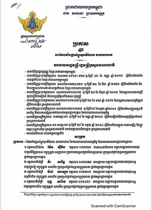 នេះបើយោងតាមប្រកាសចុះថ្ងៃទី១៩ ខែសីហា ឆ្នាំ២០២២ ដែលចុះហត្ថលេខាដោយសម្តេចពិជ័យសេនា ទៀ បាញ់ ឧបនាយករដ្ឋមន្ត្រី រដ្ឋមន្ត្រីក្រសួងការពារជាតិ៕