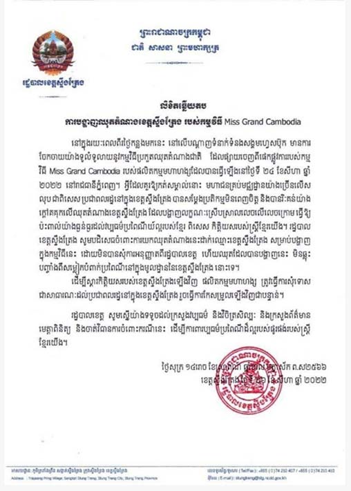 ស្ទឹងត្រែង ៖ រដ្ឋបាលខេត្តស្ទឹងត្រែងបានចេញលិខិតឆ្លើយតបការបង្ហាញឈុតតំណាងខេត្ត ដែលកម្មវិធី Miss Grand Cambodia បានបញ្ចេញយ៉ាងច្បាស់ស្ទើរតែឲ្យជនជាតិខ្មែរមួយនេះ ដើរស្រាតបង្ហាញកេរ្ត៍ជូនពិភពលោកបានឃើញថា ប៉ុណ្ណា មិនចាញ់ជនជាតិអឺរ៉ុបឡើយ ។